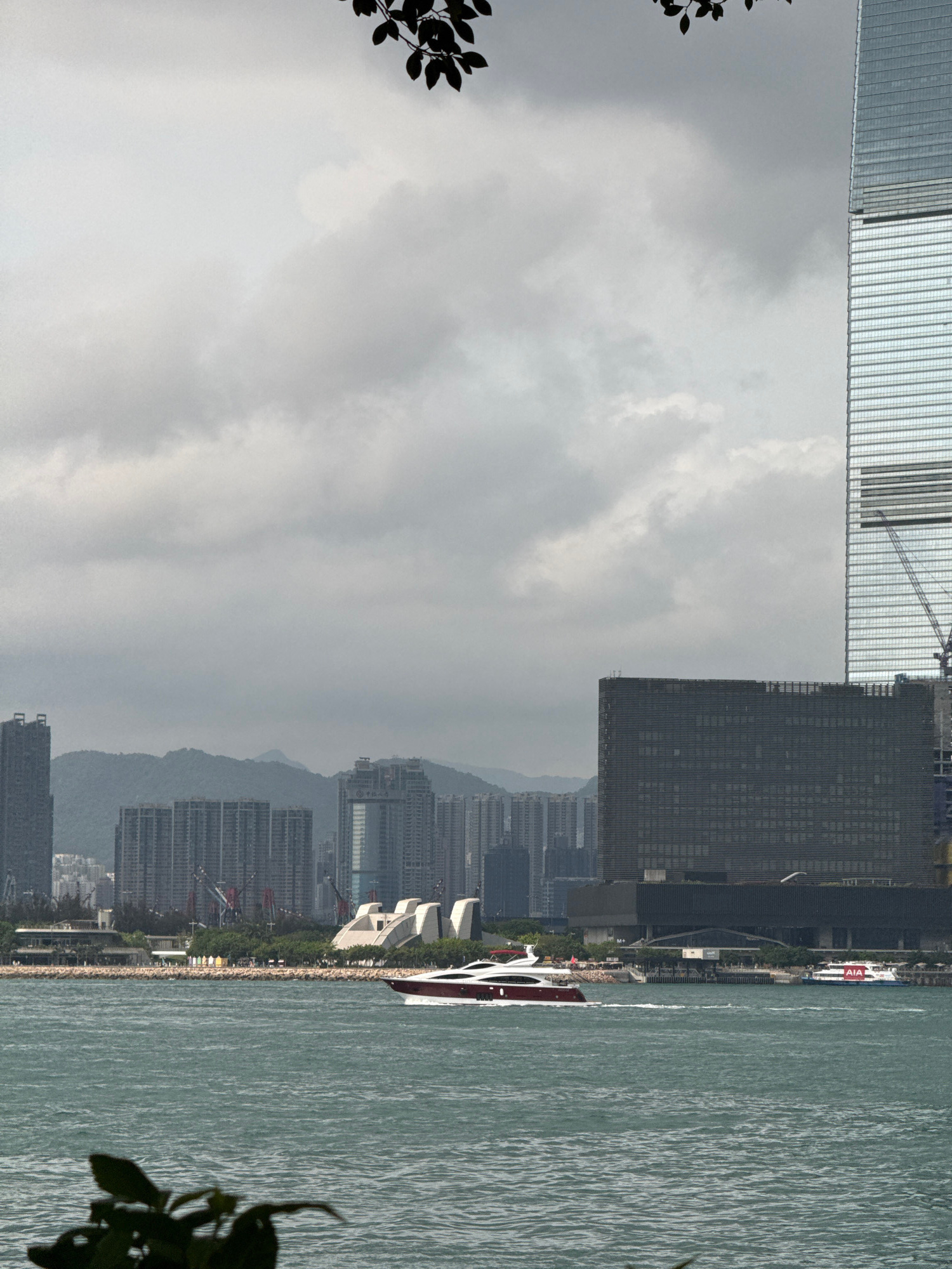 The image depicts a cityscape in Hong Kong, China, featuring a waterfront view with several tall buildings. The sky is overcast with clouds. A large body of water occupies the right side of the image,…read more