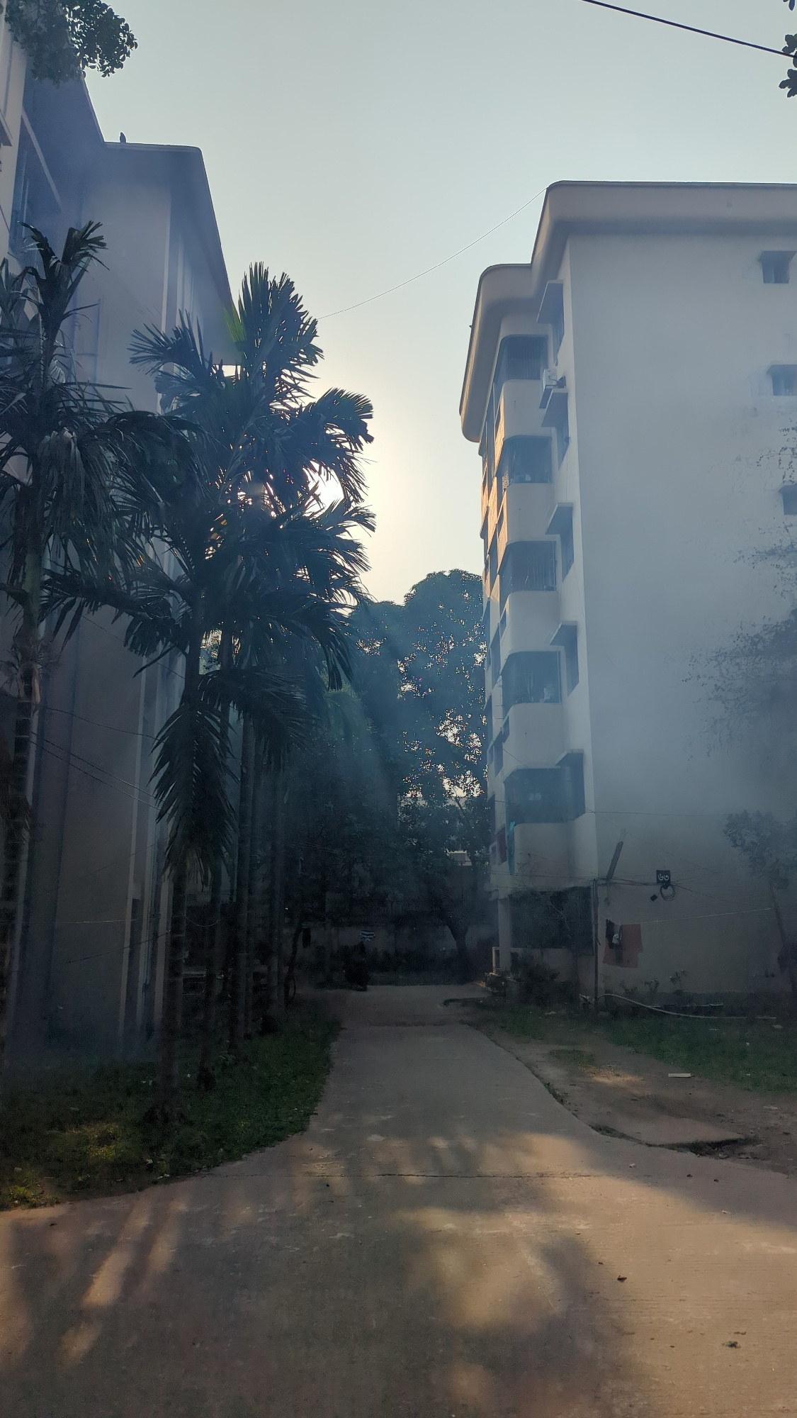 The image shows a street scene in Dhaka, Bangladesh, with a partially obscured sun and overcast sky. The foreground features a row of palm trees. Behind the trees are two multi-story buildings. One bu…read more