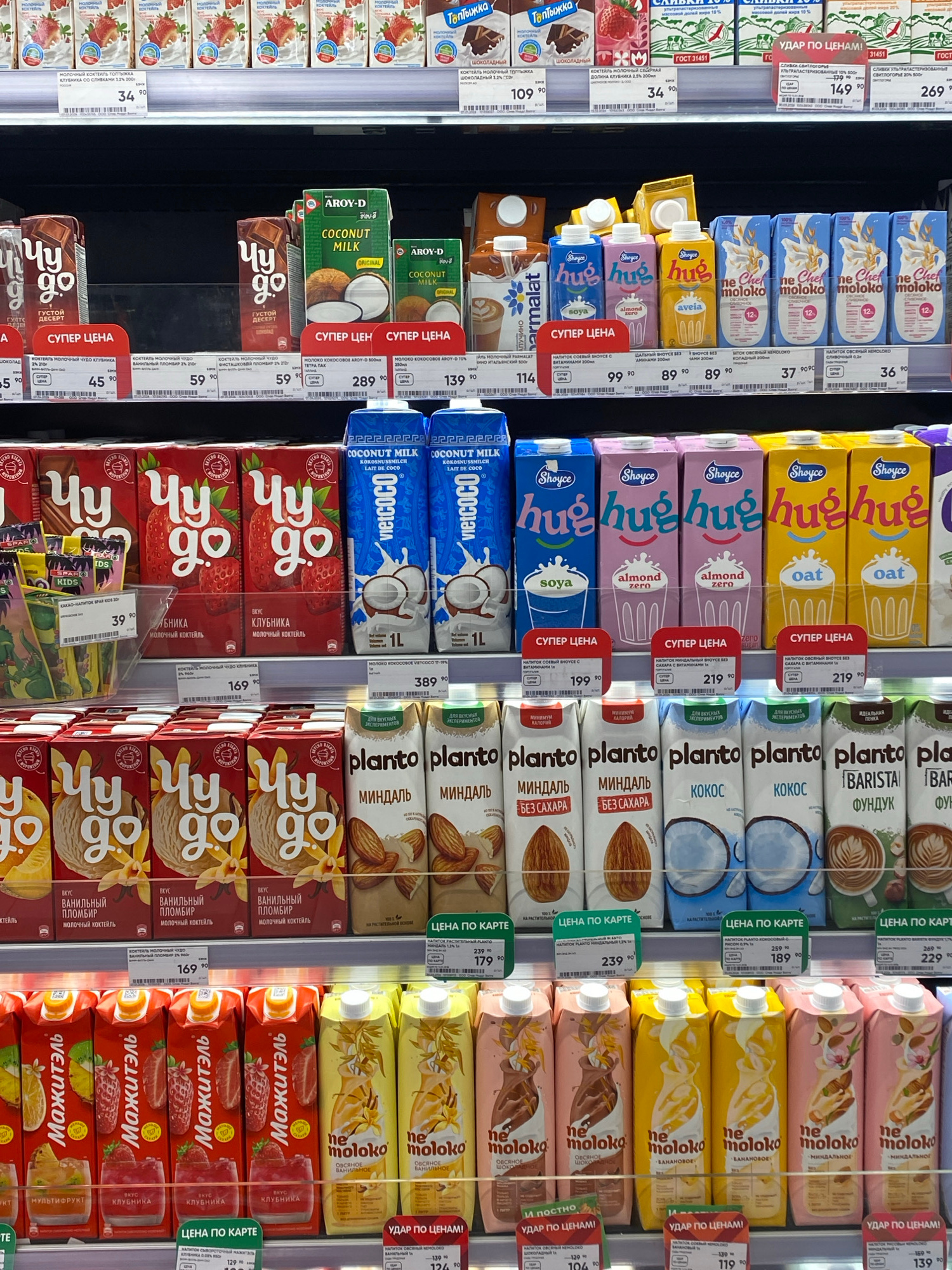 The image depicts a refrigerated shelf in a grocery store in Kazan, Russia. The shelves are stocked with a variety of milk and milk alternatives. Several brands are visible, including "Chudo," "Aroy-D…read more