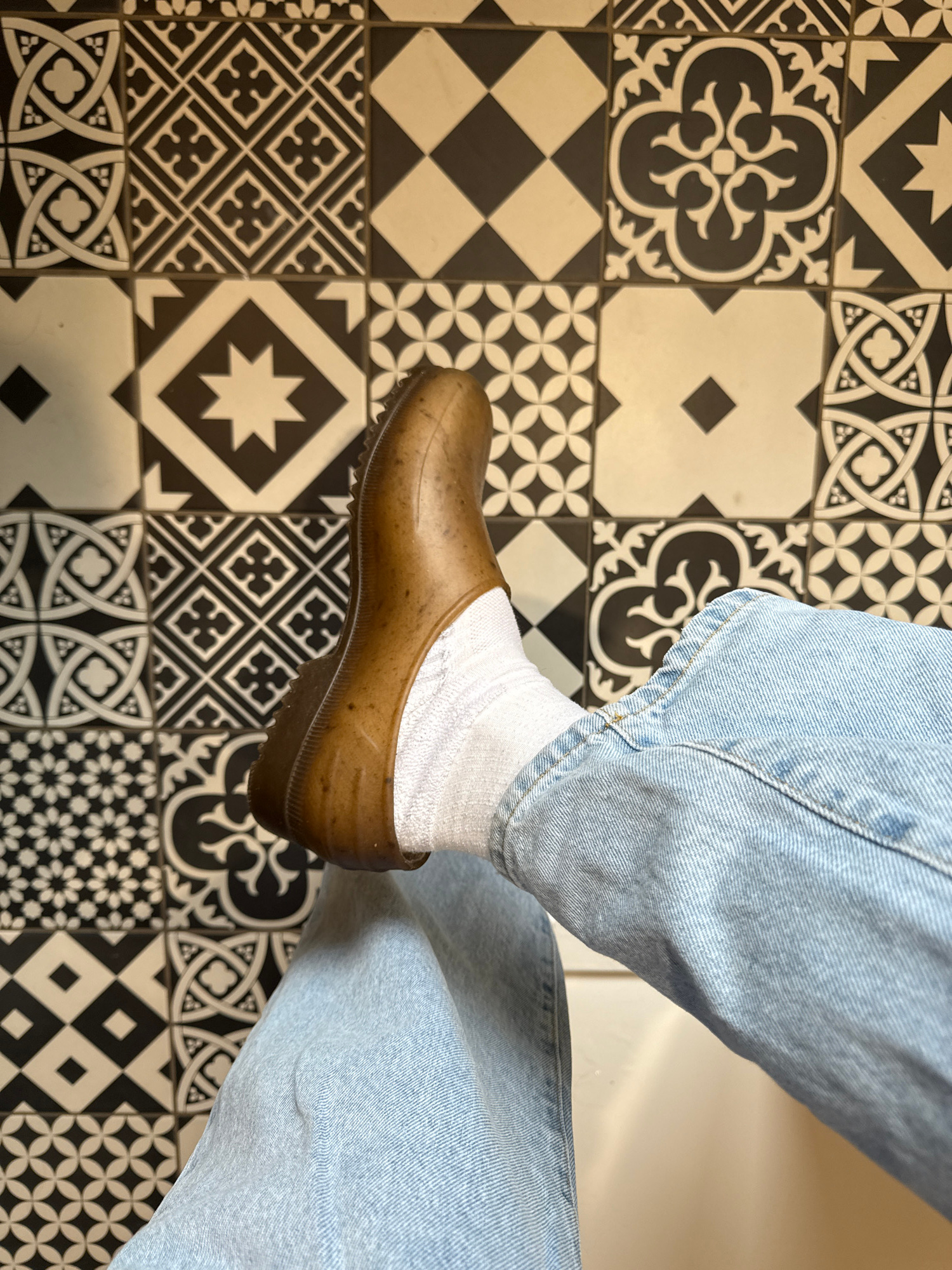 The image depicts a person wearing light blue denim jeans, a white sock, and a brown clog-style shoe. The person is standing on a patterned black and white tile floor. Each tile square contains a diff…read more