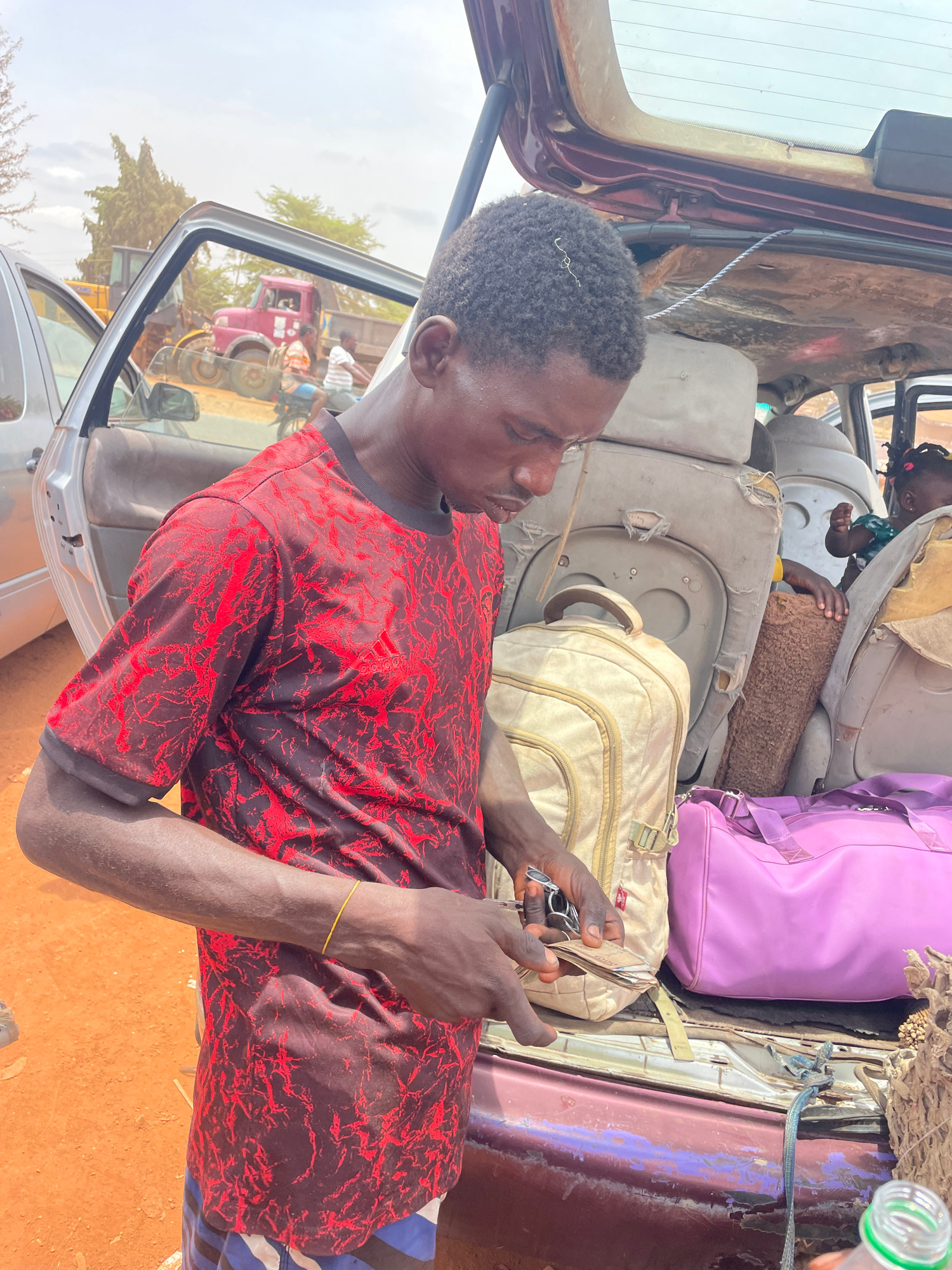 Inside a vehicle, a man with dark skin and short dark hair is seen holding a mobile phone in his hands, looking at it attentively. He is wearing a red and black shirt and is positioned near the open d…read more