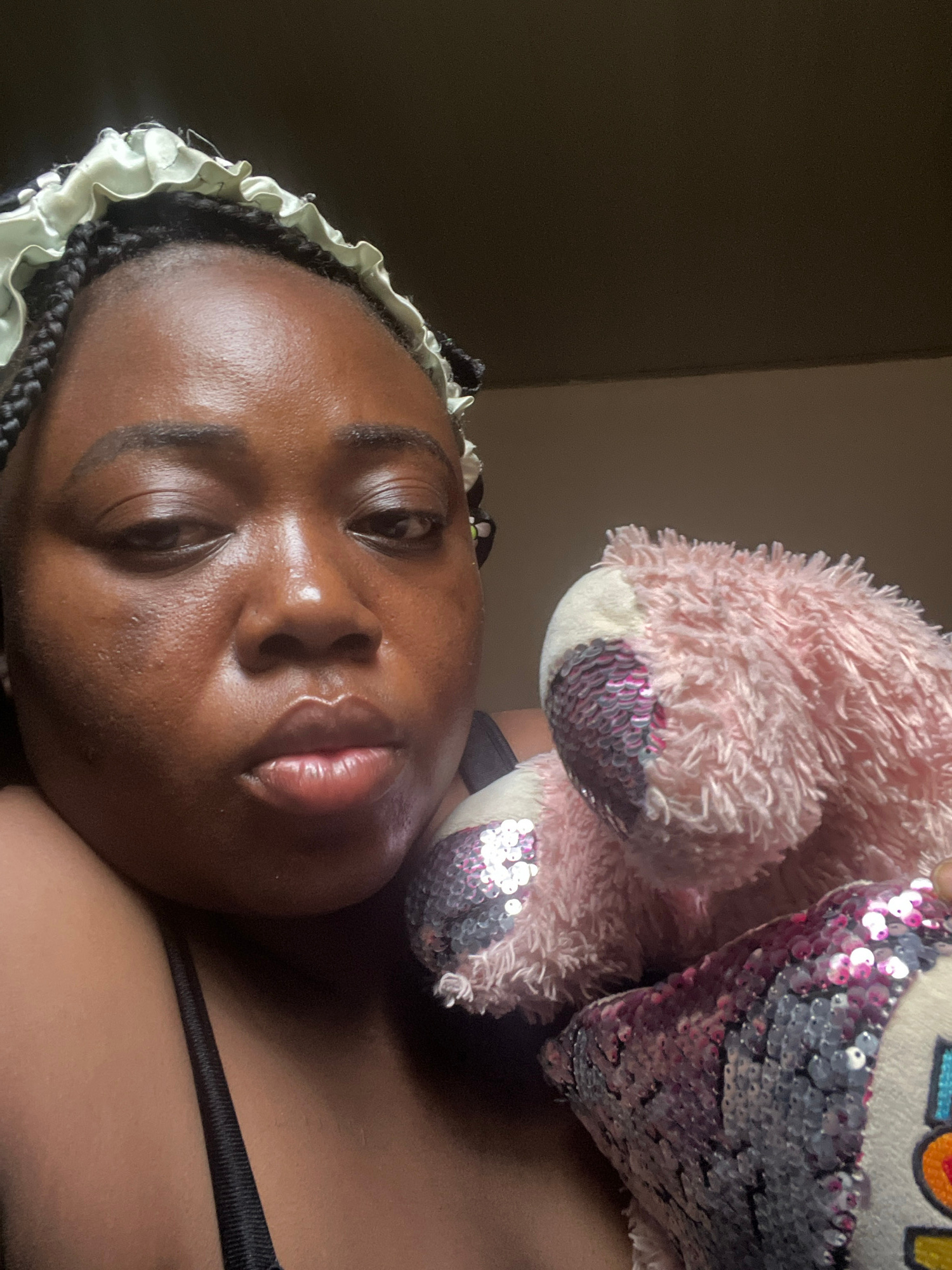 The media file presents a rotated close-up portrait of a young Black woman, likely in an indoor setting in Abuja, Nigeria. She is lying down, looking directly at the viewer. Her skin appears radiant w…read more