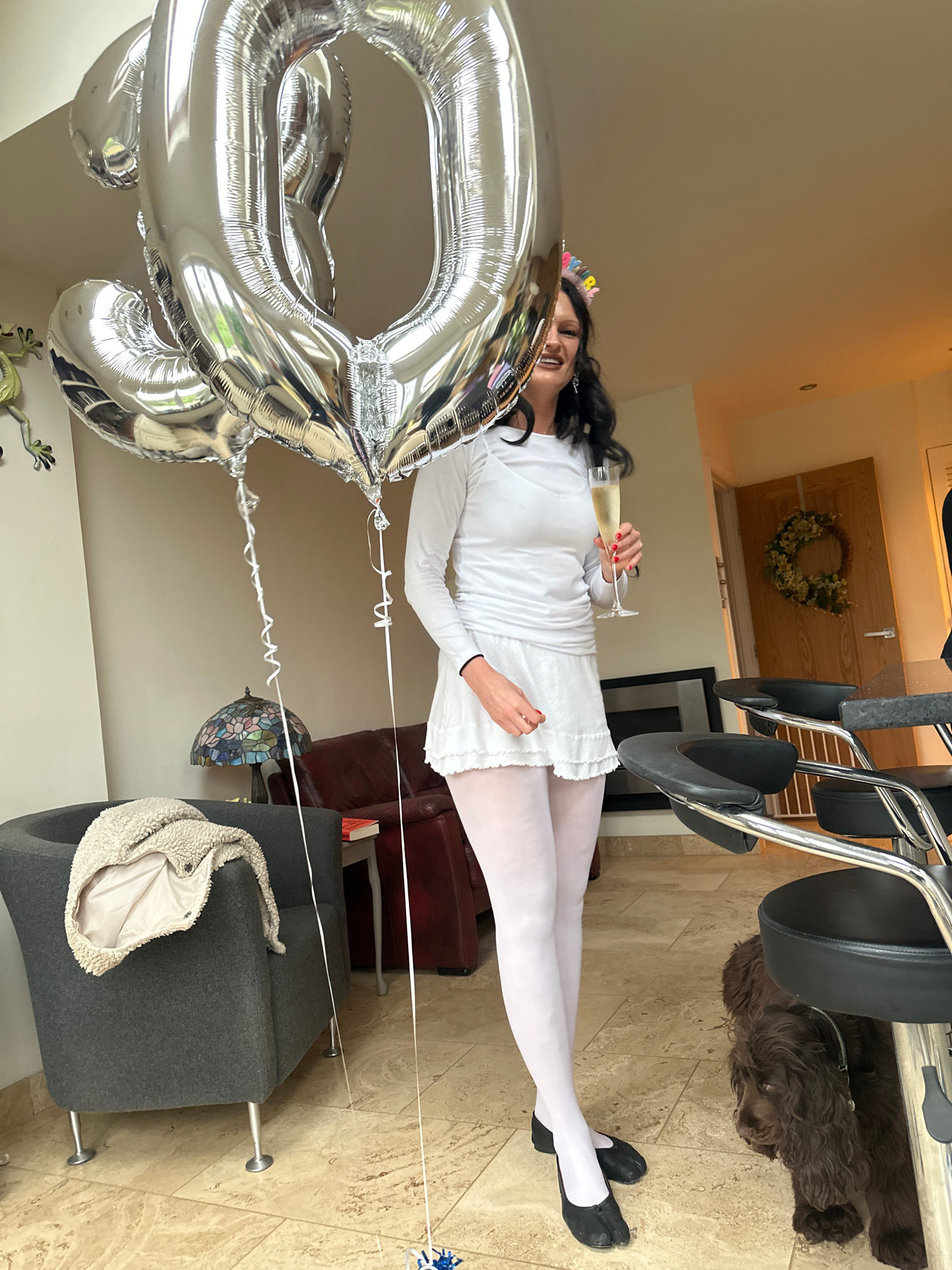 The image captures a joyful indoor scene, oriented 90 degrees clockwise from its natural upright position, likely celebrating a birthday. The central figure is a smiling woman with long, dark, wavy ha…read more