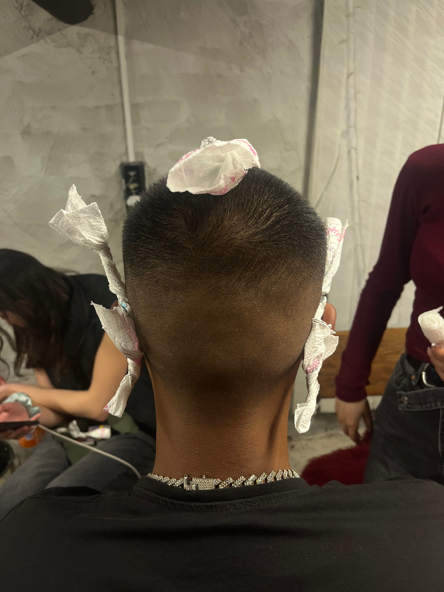 The image depicts a person with a short, dark haircut, and several pieces of white tissue paper attached to their head. They are wearing a black shirt and a silver chain necklace. The surrounding peop…read more
