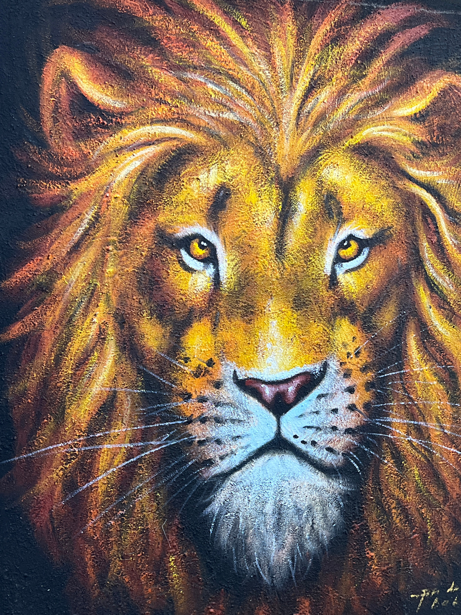 A close-up, slightly off-center, and vertically-oriented painting depicts a lion's face. The lion's mane is rendered in warm tones of yellow, orange, and brown, contrasting with the dark background. T…read more