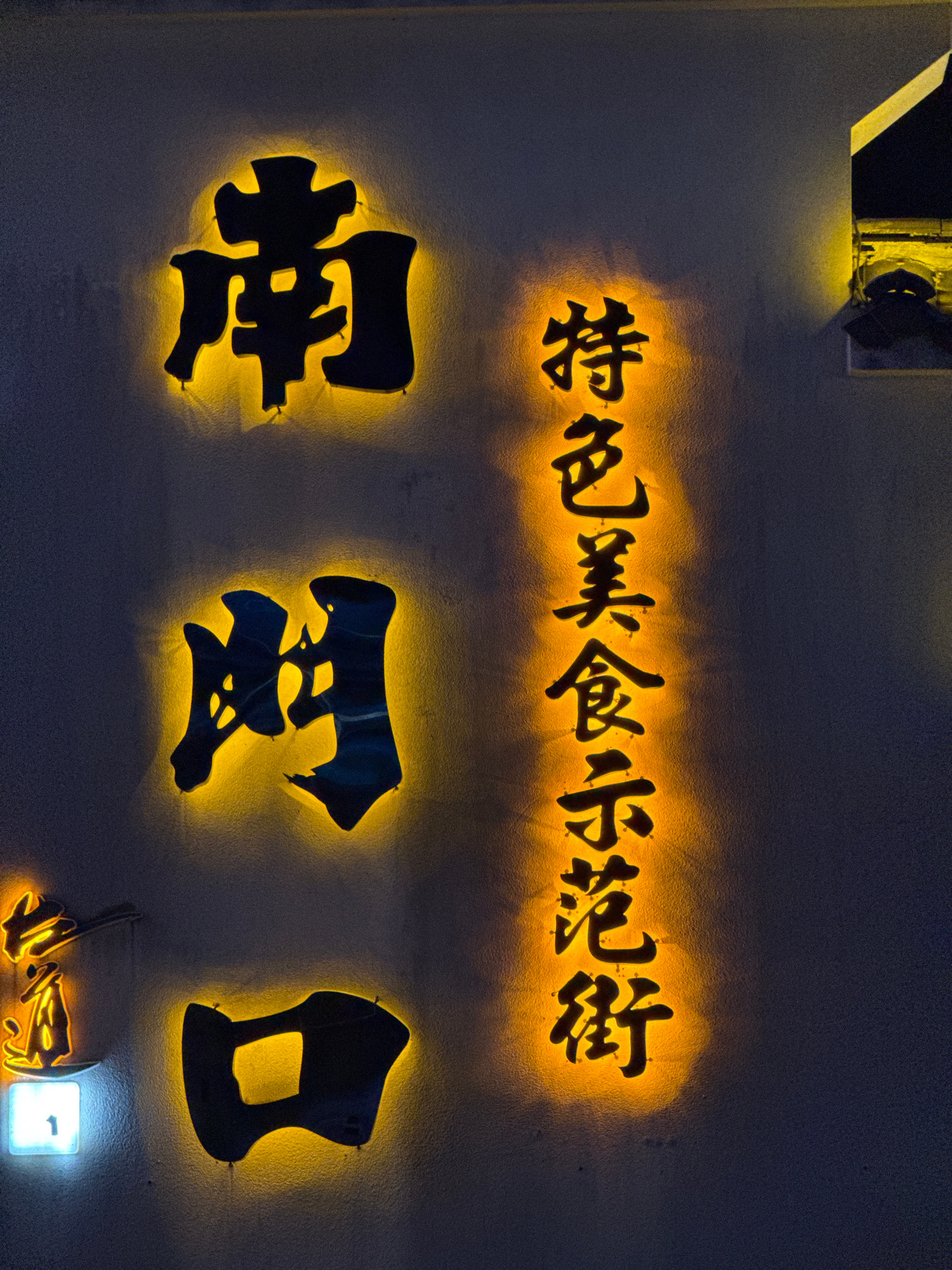 The image depicts a sign on a wall in Zhangjiajie, China. The text is in Chinese characters, illuminated from behind with a warm, yellow light. The top line of text reads "Zhangjiajie Meishi Xiaochi"…read more