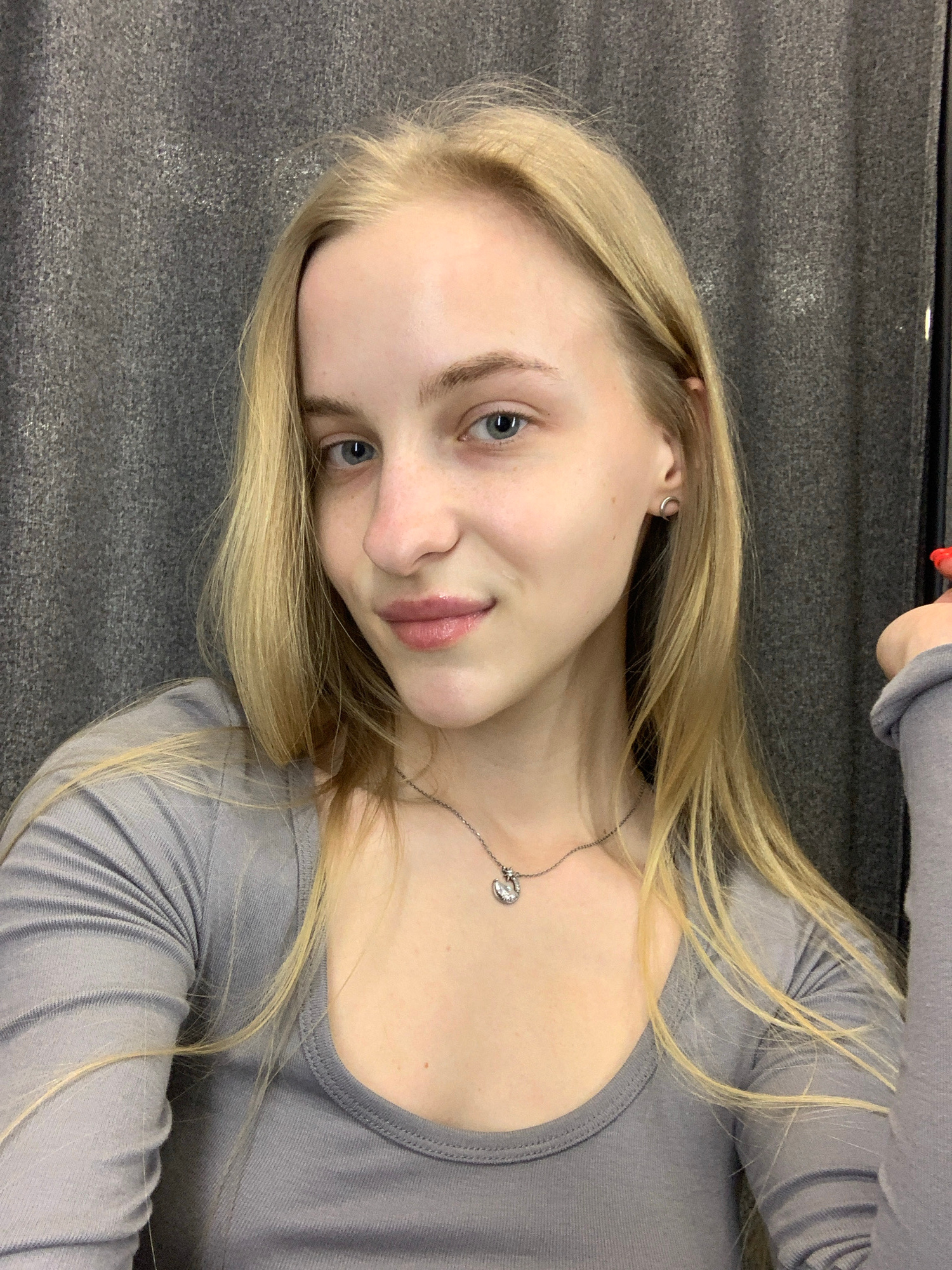 A light-skinned female with blonde hair and blue eyes poses for a selfie in an indoor location. She is wearing a grey long-sleeved shirt and a delicate necklace. The background appears to be a grey cu…read more
