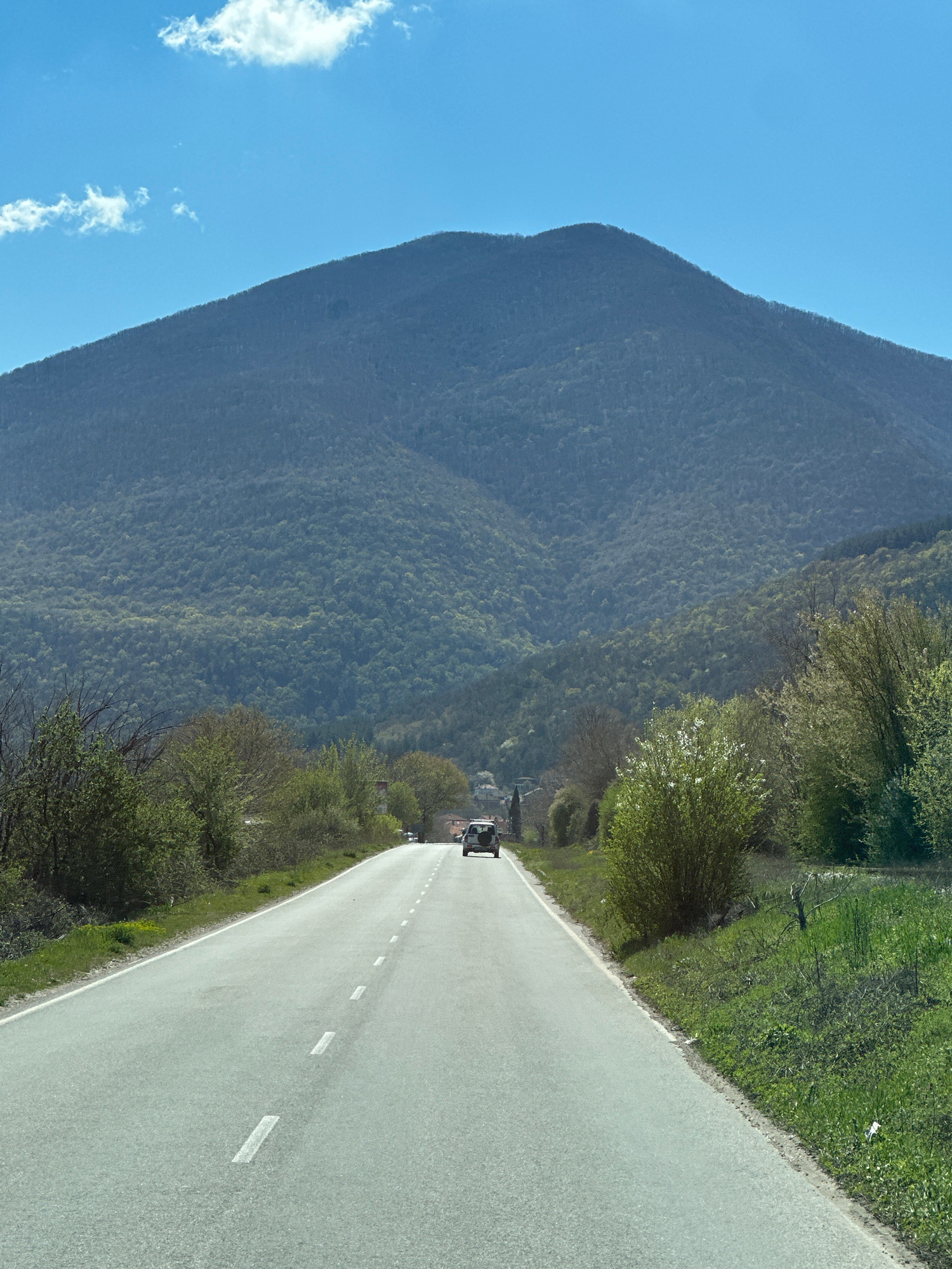 The image shows a road winding through a mountain landscape, potentially near Varvara, Bulgaria. The road is paved with white lane markings and a vehicle visible in the distance. Lush green vegetation…read more