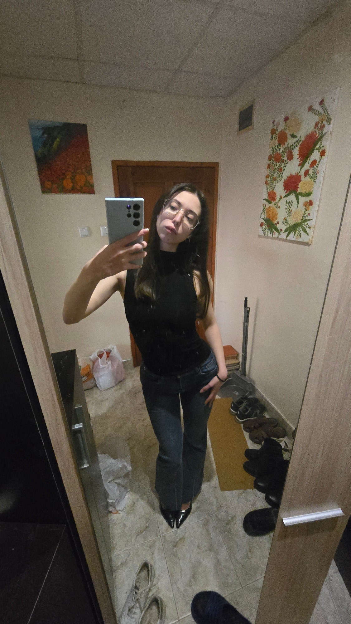 A mirror selfie shows a woman with long, dark hair, wearing glasses, a black top, and jeans. She's holding a phone to take the photo. The mirror reflects a hallway with a door, artwork on the wall, an…read more