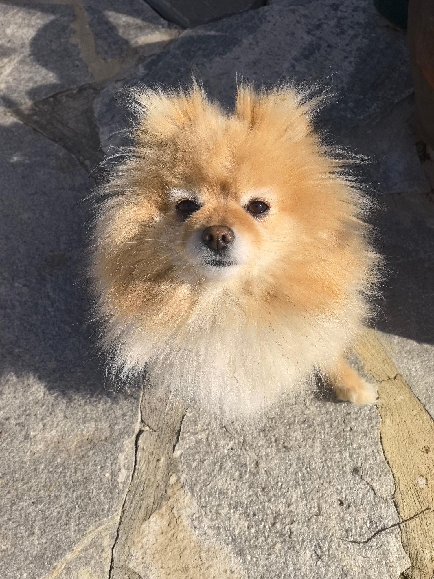 A Pomeranian dog sits on a light gray stone surface. The dog is mostly light orange in color, with a cream-colored chest. The background consists of various shades of gray and shadow. The location app…read more