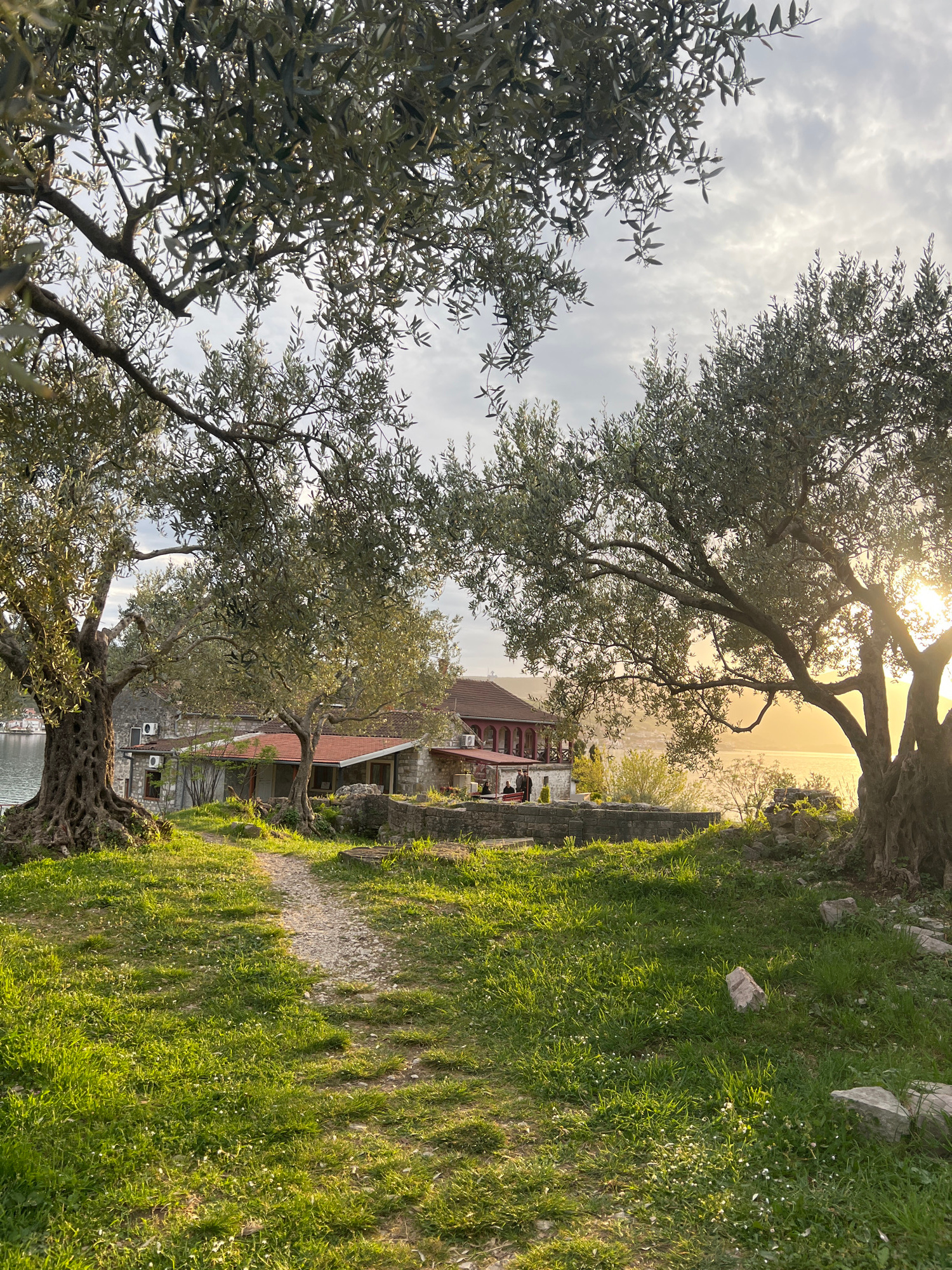 The image depicts a landscape in Đuraševići, Montenegro. The foreground features two mature olive trees with gnarled trunks and dense foliage, framing the scene. Between the trees, a narrow gravel pat…read more