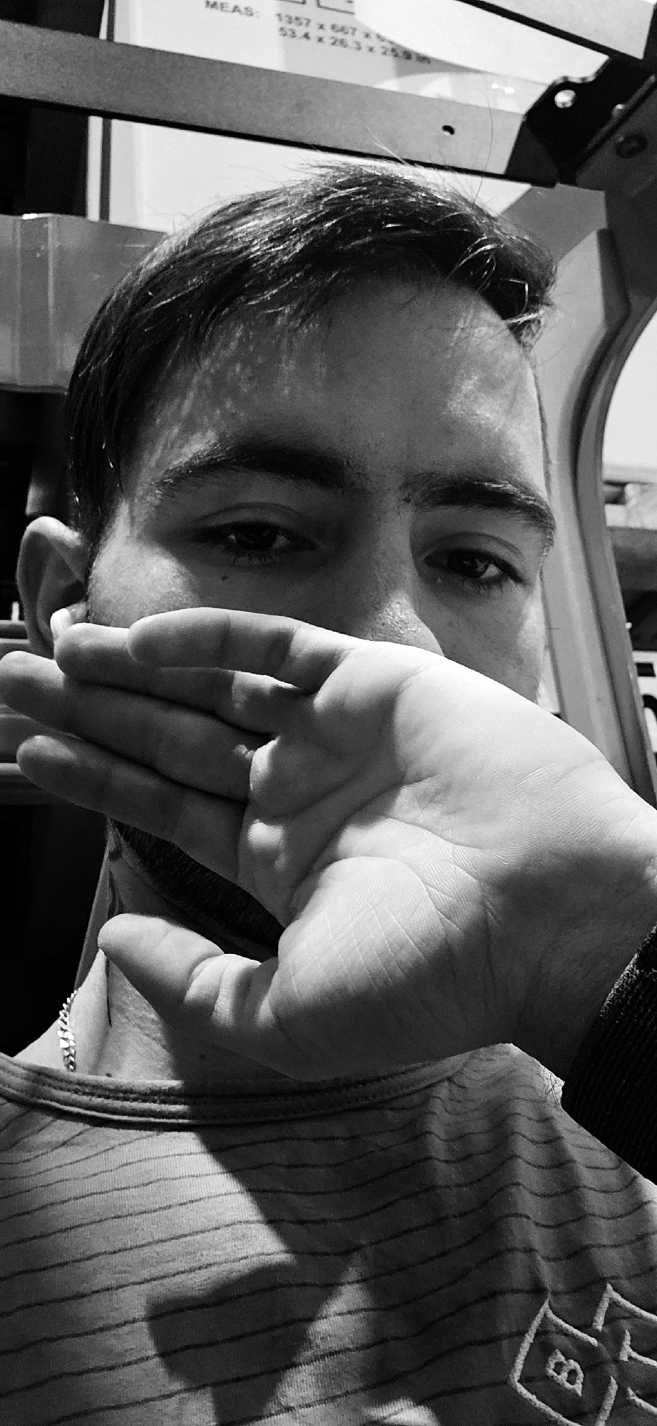 This black and white, close-up image features a person, likely a young adult, with their face partially obscured by their right hand. The image is presented with a horizontal orientation, though the s…read more