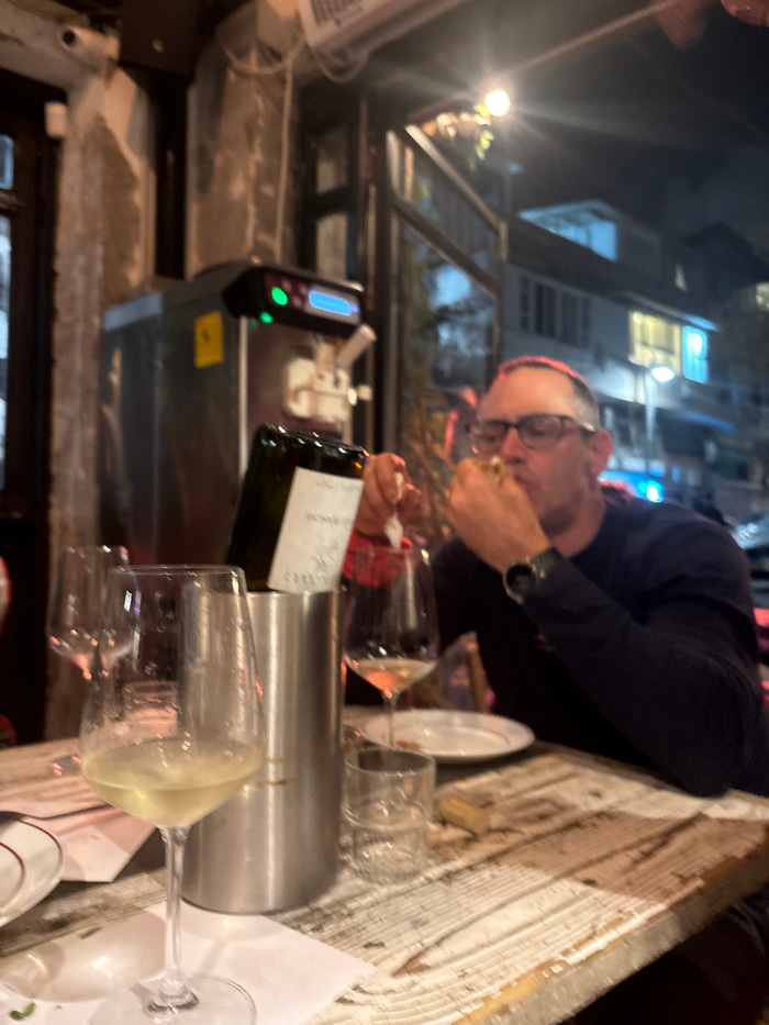 A man in a dark shirt and glasses eats while seated at a table with multiple wine glasses, a wine bottle, and a chiller. A machine with a digital display sits nearby. Overhead, a glass roof reveals a…read more