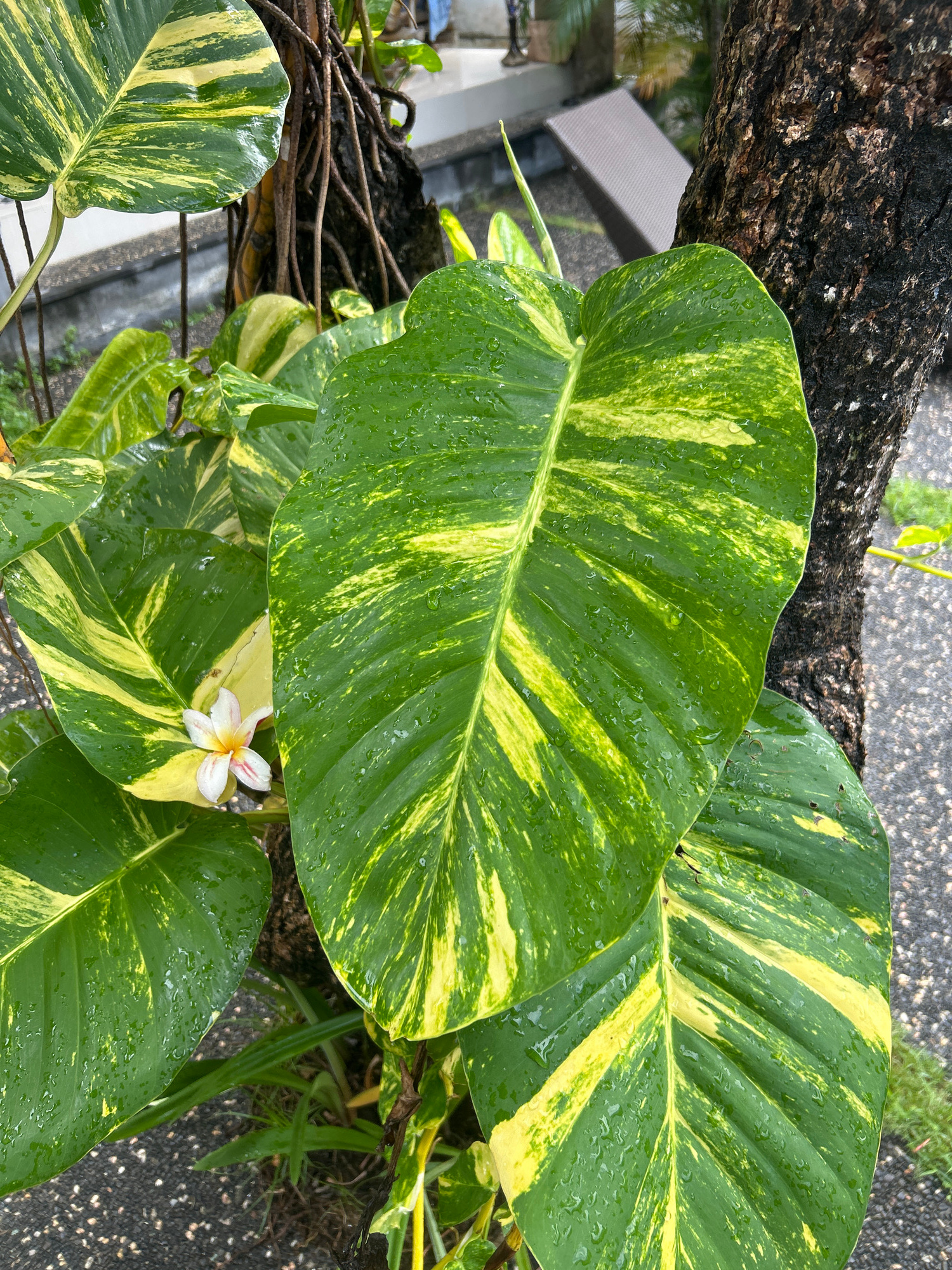 The image presents a close-up, top-down view of large, variegated leaves, likely from a Pothos plant (Epipremnum aureum), adorned with numerous water droplets. The leaves exhibit a striking pattern of…read more