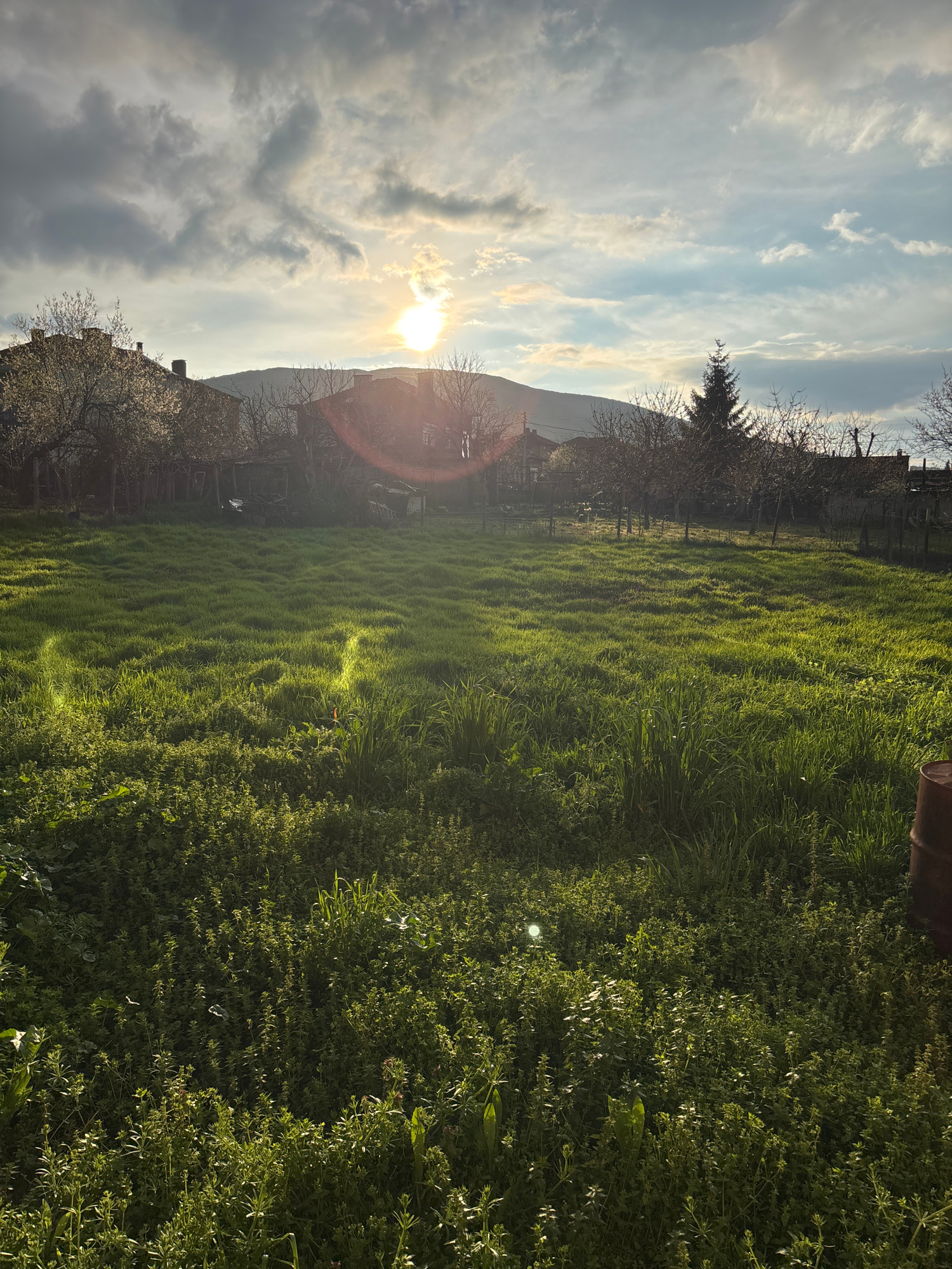 The image depicts a sunlit, grassy field in what appears to be a rural or suburban area, possibly Kuklen, Bulgaria. The sun is partially obscured by clouds and a mountain ridge, creating a lens flare…read more