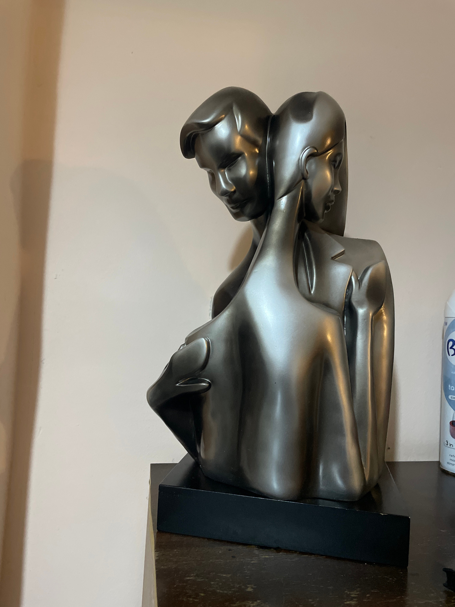 A close-up, indoor shot shows a silver-toned sculpture of two human figures intertwined on a dark, rectangular base. The background is a plain, off-white wall. At the top right, a white and blue bottl…read more