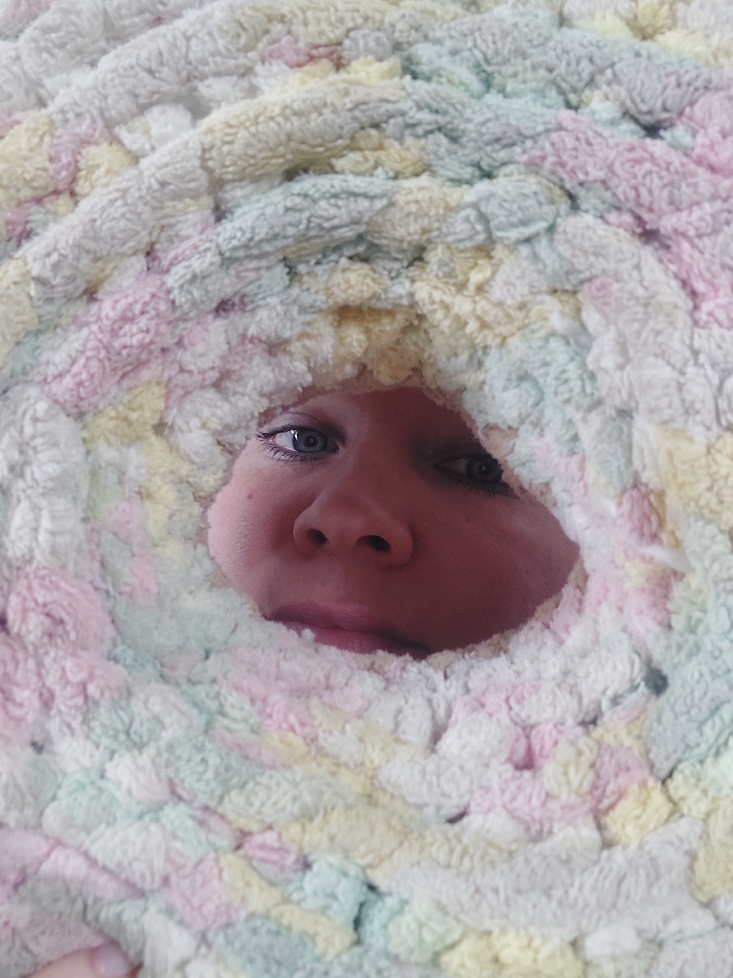 A person's face is visible through a hole in a pastel-colored, looped yarn blanket. The face, featuring a nose, eyes, and a slightly open mouth, is positioned centrally within the circular opening. Th…read more