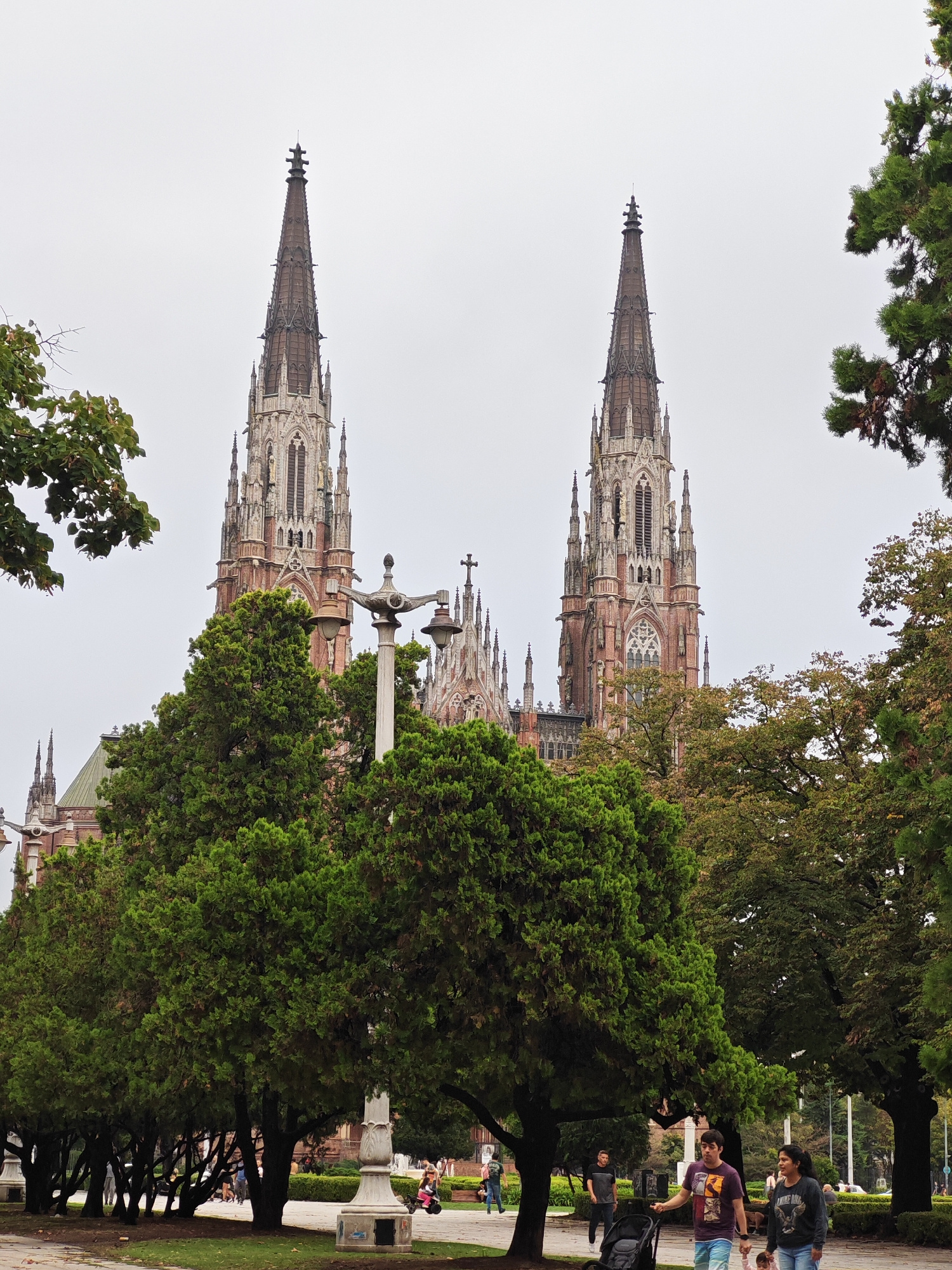 The image captures the Cathedral of La Plata, Argentina, prominently featuring its neo-Gothic spires, partially obscured by lush green trees. The foreground shows a well-maintained park setting with m…read more