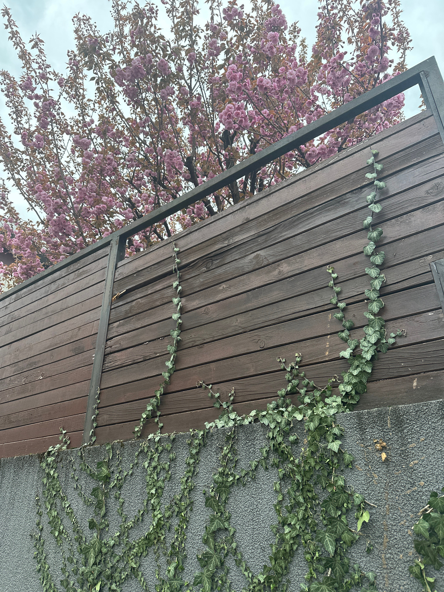 The image depicts an outdoor scene in Zagreb, Croatia, featuring a wooden structure with ivy vines growing on it and on an adjacent wall. A blossoming cherry tree with pink flowers is visible behind t…read more