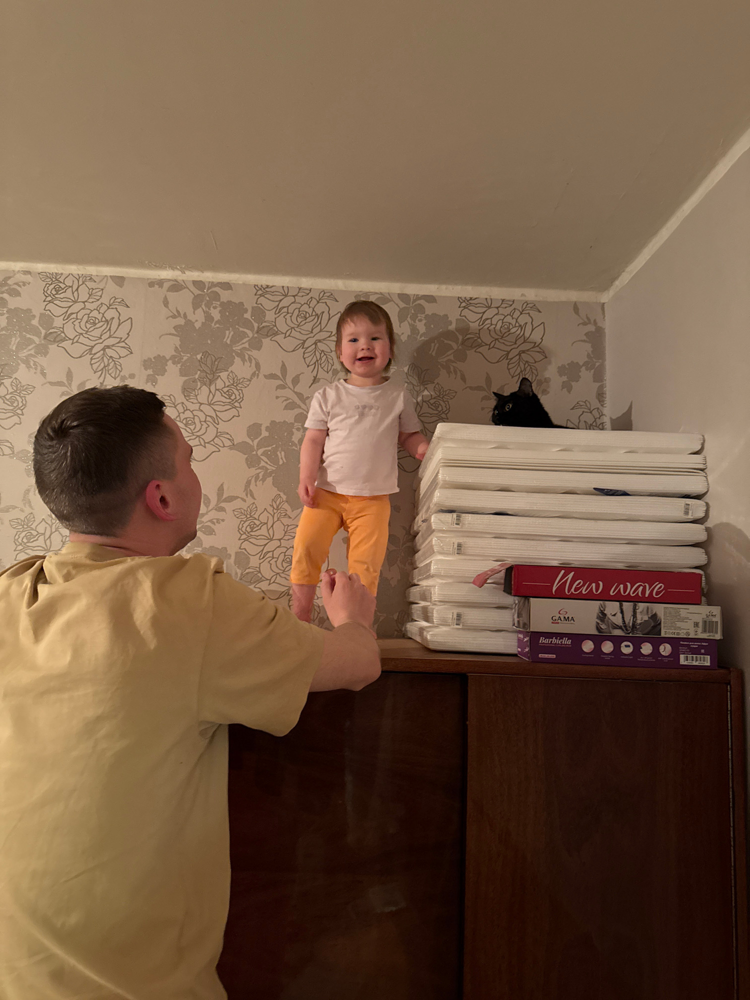 The image shows a man, a child, and a black cat in an indoor setting. The man, wearing a light yellow shirt, is facing the camera. The child, wearing a white shirt and yellow pants, is lying on the fl…read more