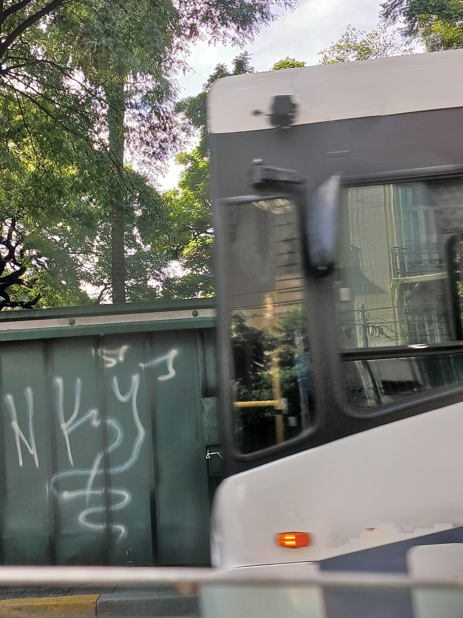 A partial view of a white and gray bus is visible in front of a green wall with white graffiti. Trees are visible behind the bus, suggesting an urban environment. The context clues, such as the graffi…read more
