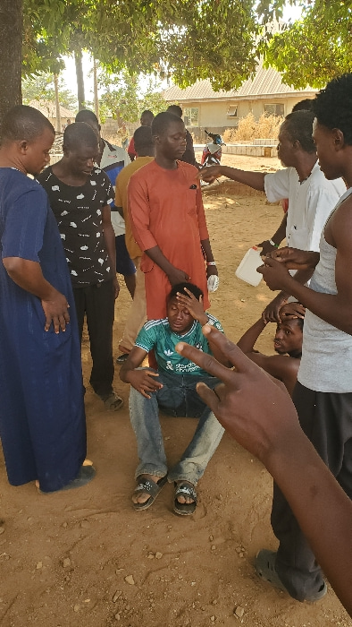 The image captures an outdoor scene in the city of Akwanga, Nigeria, showing a group of approximately ten adult males gathered on reddish-brown dirt ground under the canopy of several trees. In the im…read more