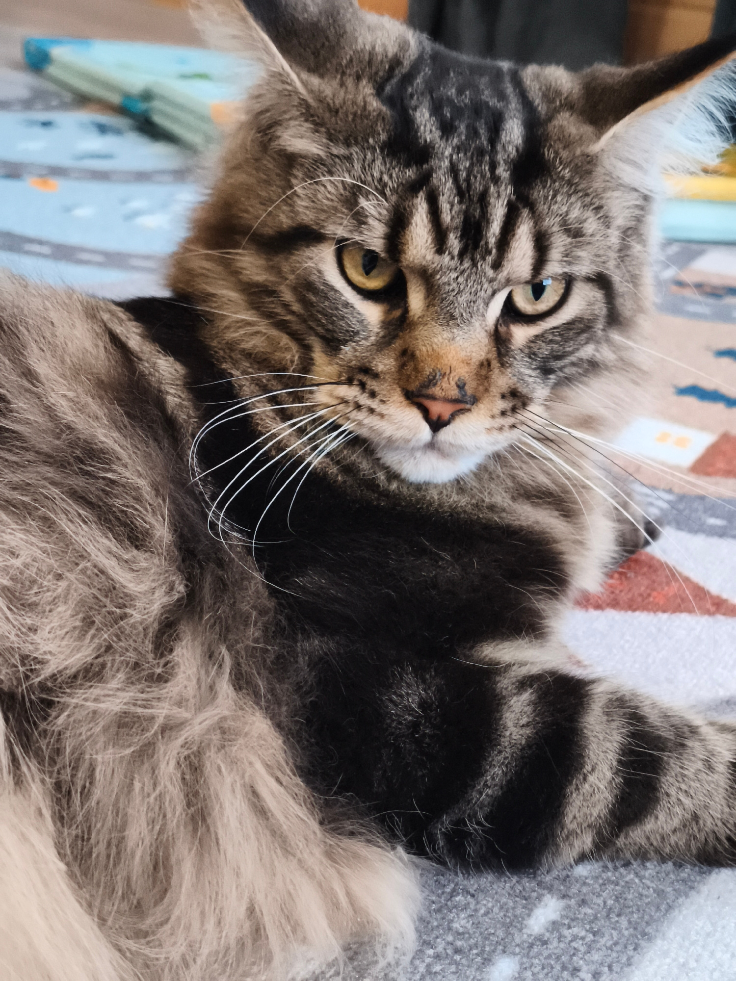 A close-up shot captures a tabby cat indoors. The cat has brown and black stripes, long white whiskers, and yellow eyes. It is lying down on a patterned blanket. The exact location and the presence of…read more