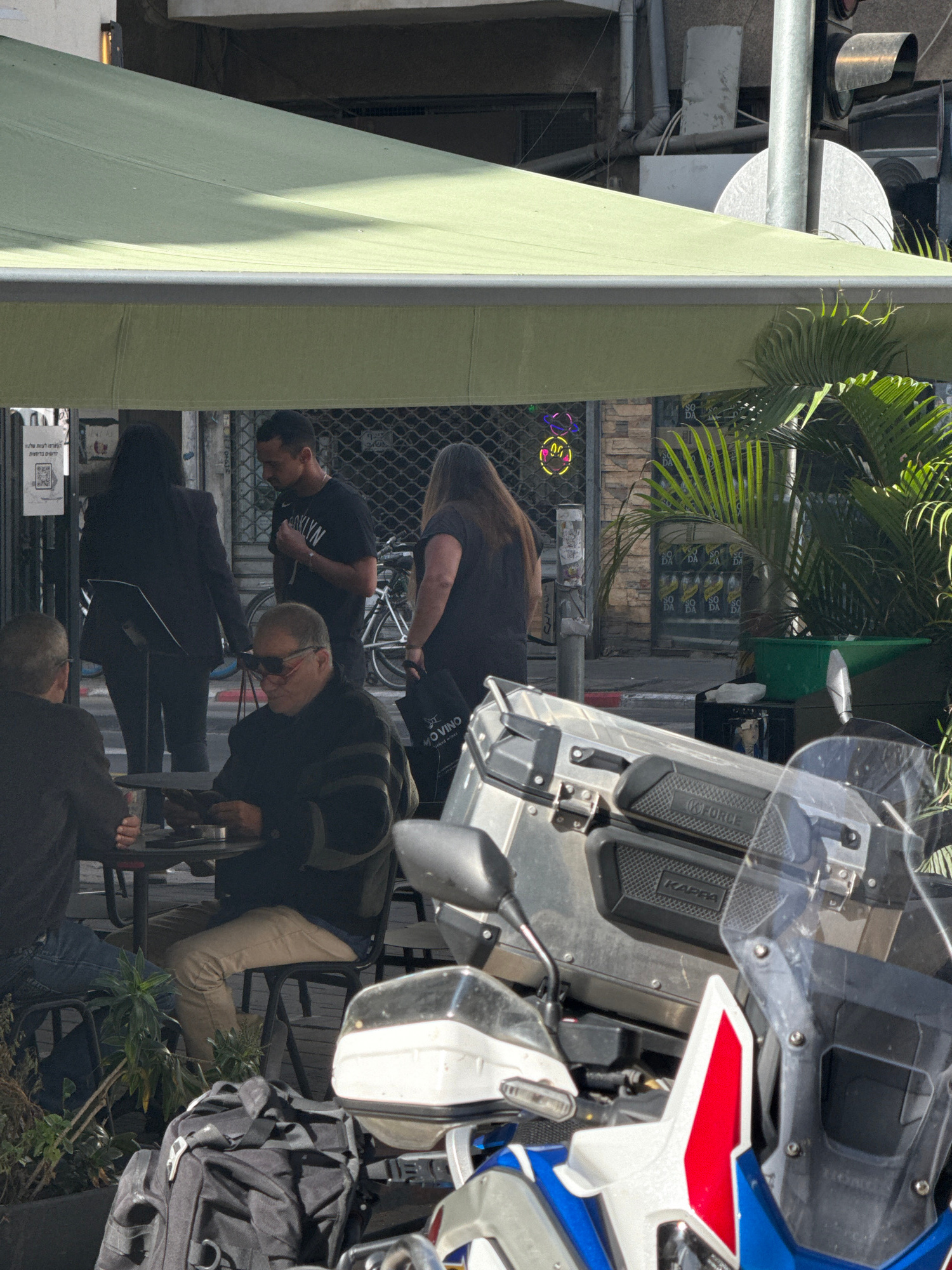 The image, rotated 90 degrees clockwise, depicts a street scene in Tel-Aviv, Israel. Several people are bent over bicycles parked against a chain-link fence. The fence is partially obscured by a light…read more
