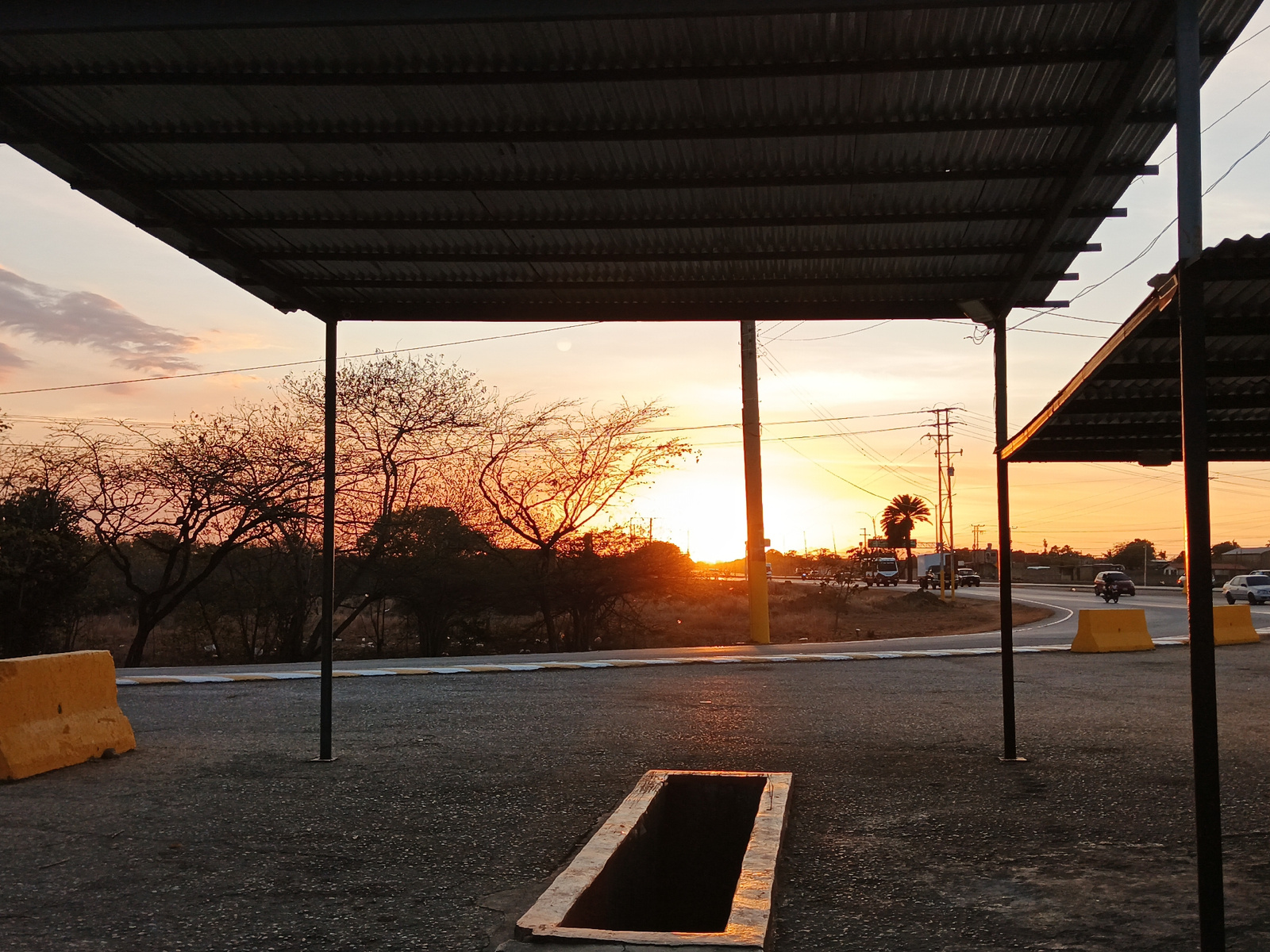 This image depicts an outdoor scene in El Dátil, Venezuela, captured during either sunrise or sunset, indicated by the low sun casting an orange glow across the horizon. In the foreground, a dark asp…read more