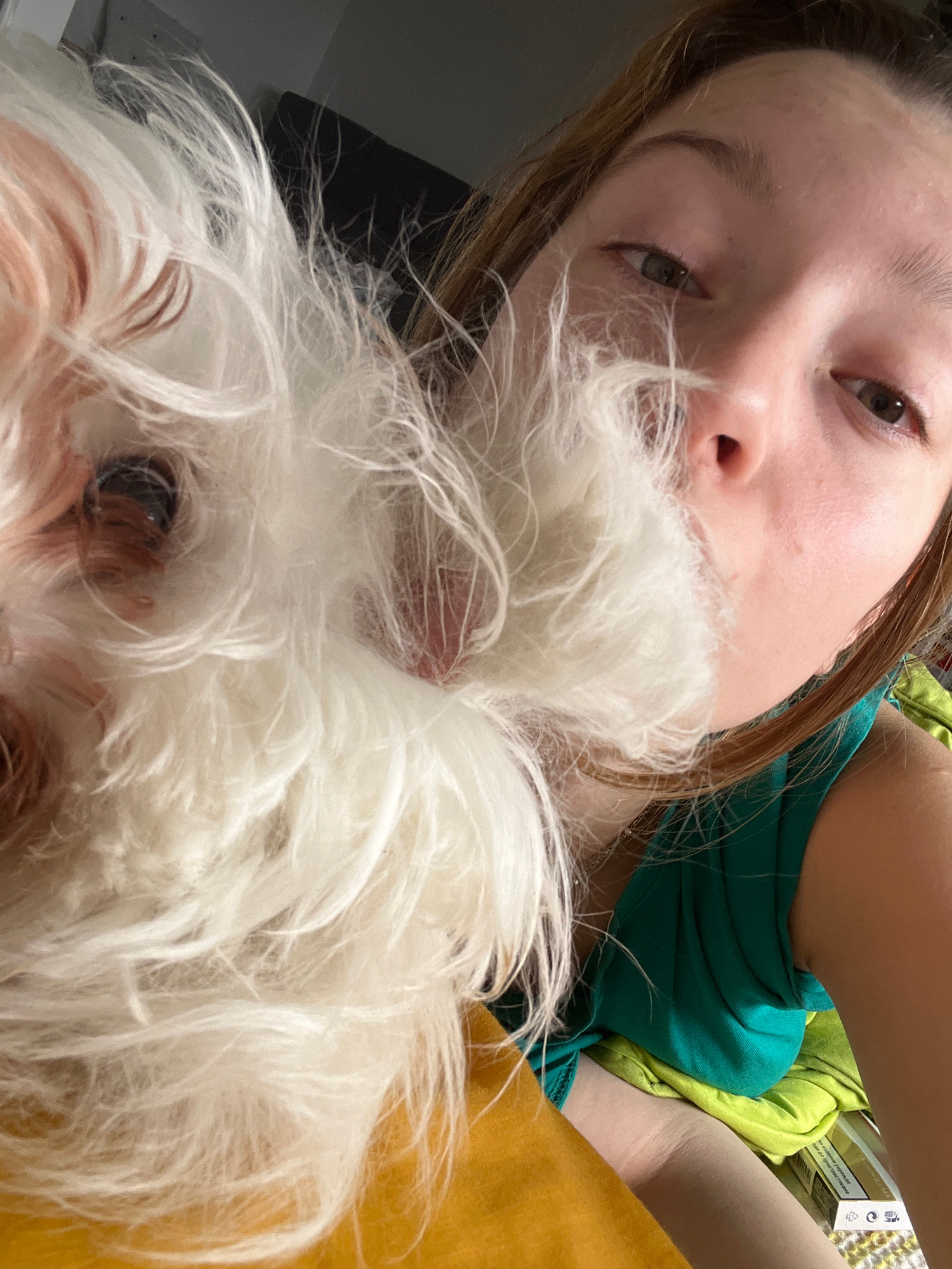A close-up selfie shows a person with light skin and brown hair looking down at the camera. Their face is partially obscured by the fluffy white fur of a small dog, likely a Maltese. The dog's eyes arβ¦read more