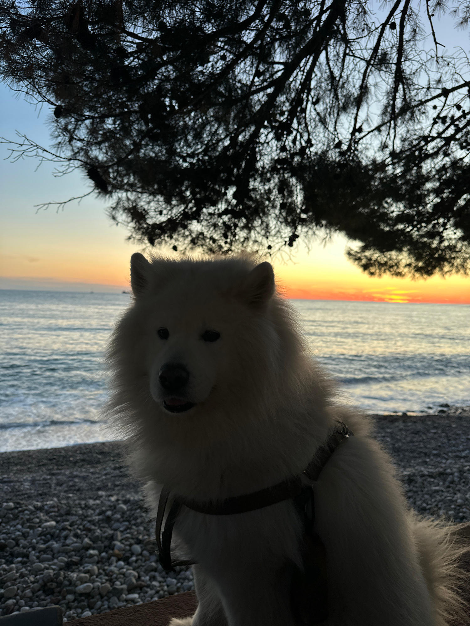 An outdoor shot shows a Samoyed dog wearing a harness standing on a pebbled beach. The ocean stretches horizontally across the frame, meeting a horizon of orange and yellow sunset. To the left, the dark silhouette of a tree frame, with visible branches and pine cones. The location is suggested to be Šušanj, Montenegro. | Open Wire