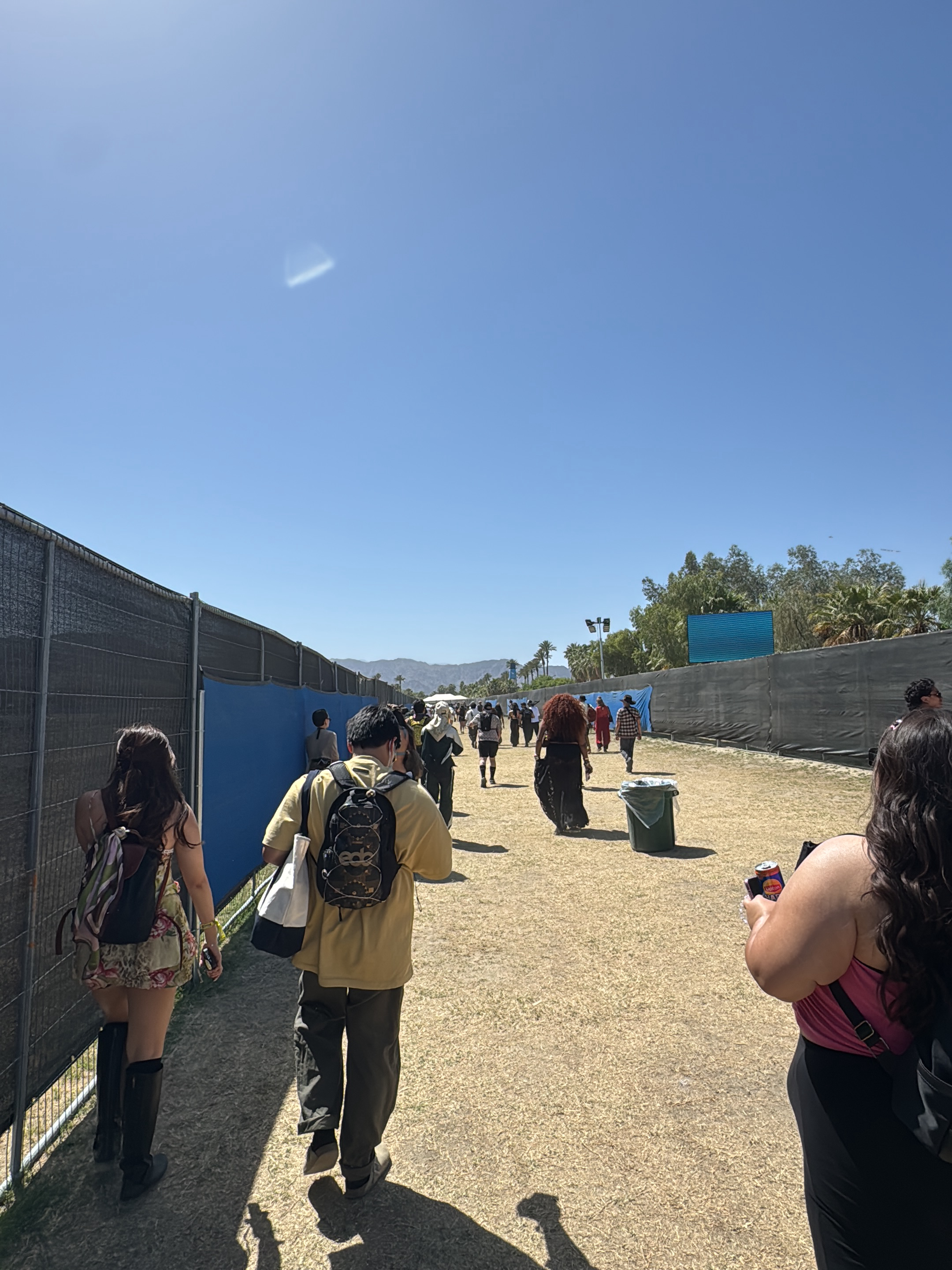 The image depicts a daytime scene at a festival in Indio, California, United States. A gravel pathway stretches into the distance, bordered on either side by a chain-link fence partially covered with…read more