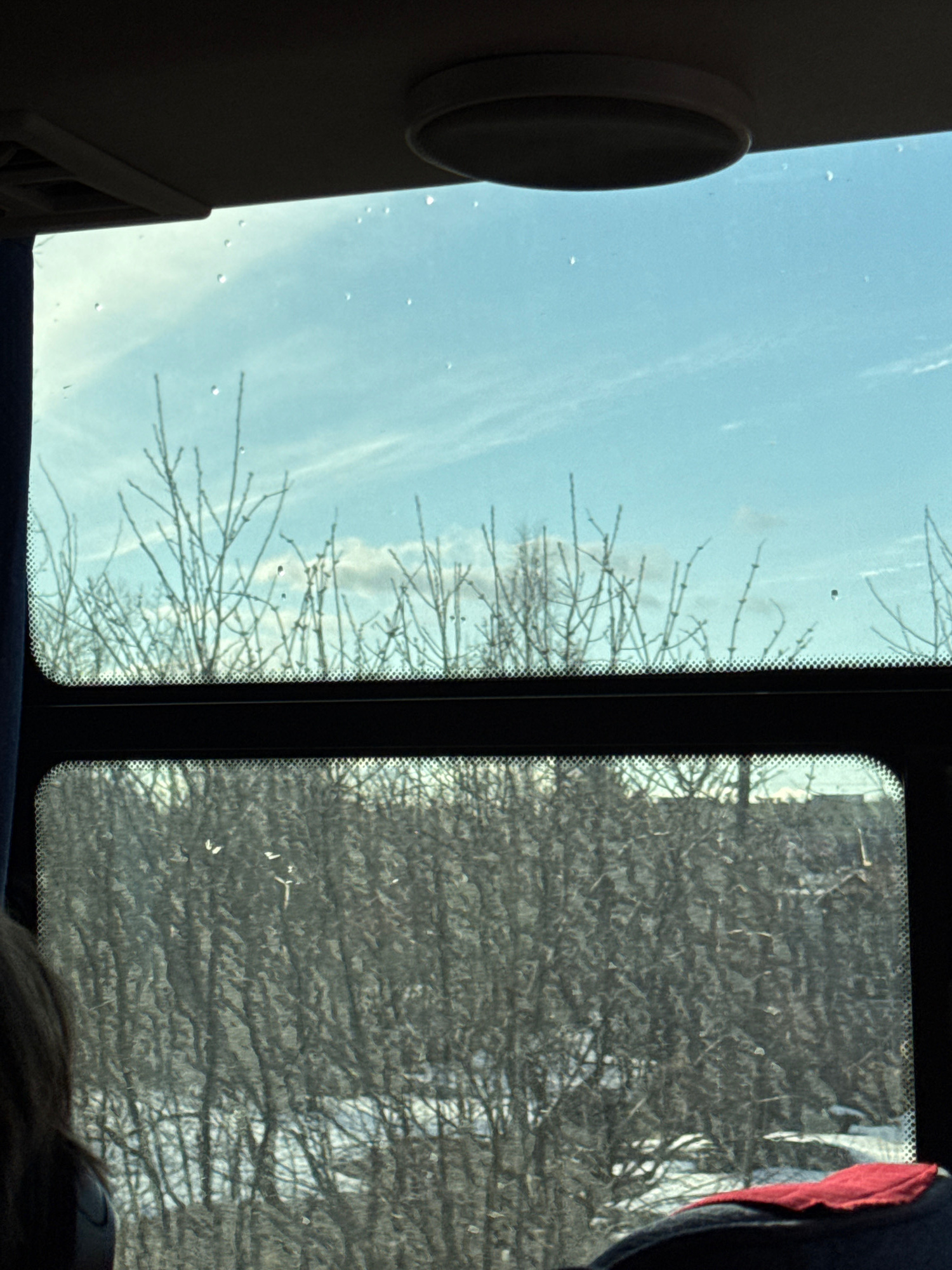 View from a bus window. Left window: clear blue sky with thin clouds, bare tree branches. Right window: dense, leafless trees/woods. Interior: part of a seat, headrest, and person's head. The location…read more