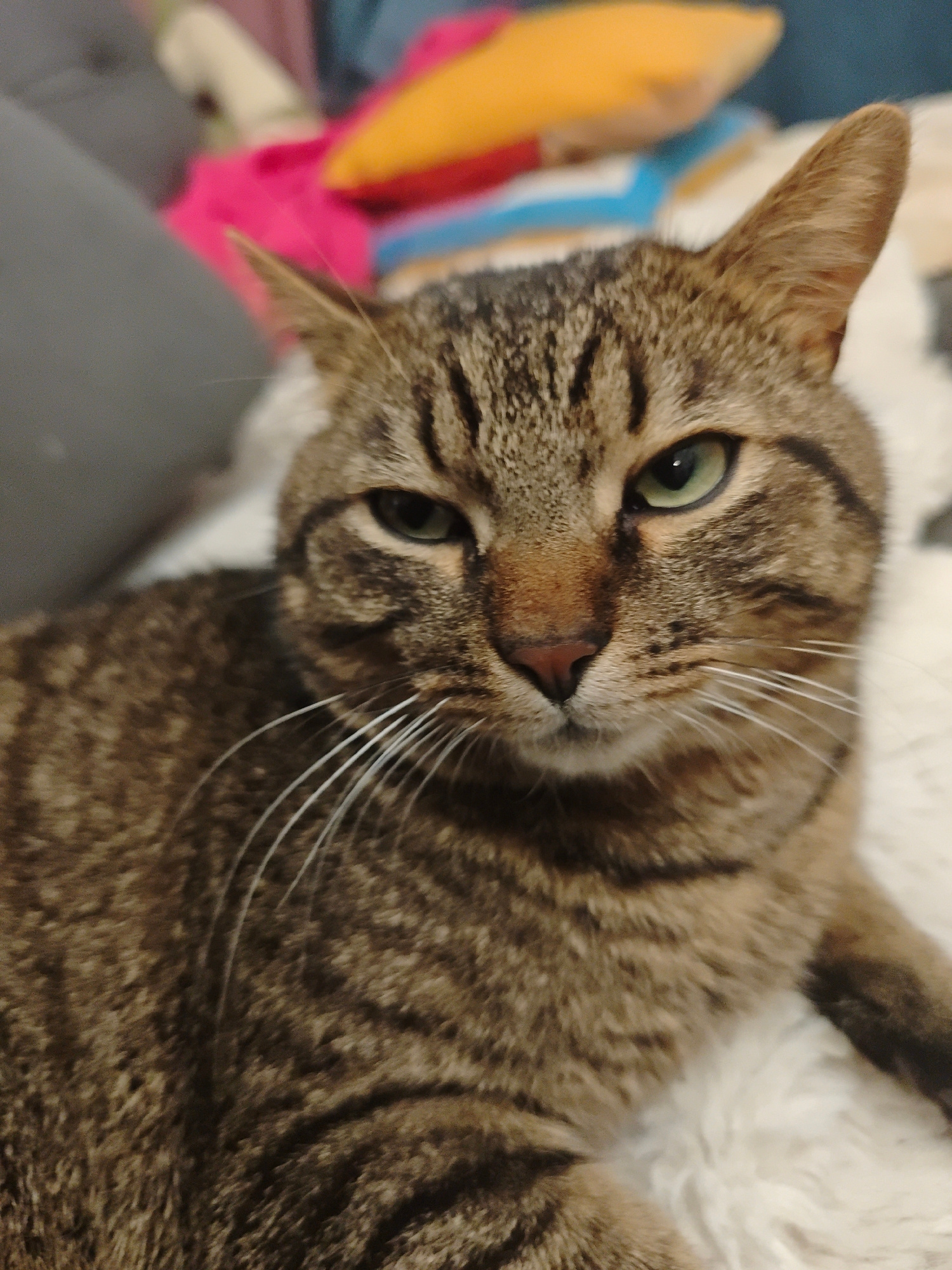 A close-up portrait shows a domestic tabby cat resting indoors. The cat has short, brown and black striped fur with a lighter underbelly. Its eyes are a vibrant green, with the left eye (viewer's left…read more