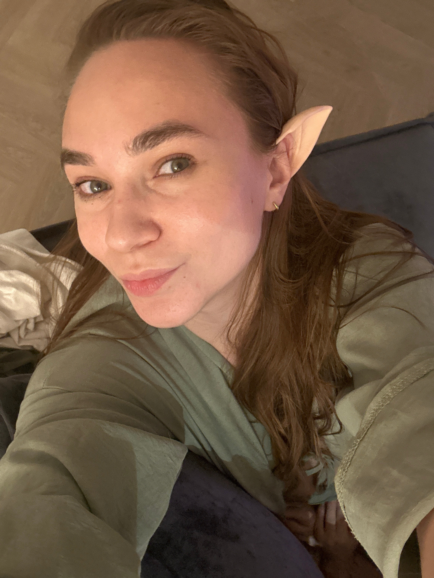 A woman is looking at the camera, wearing an elf ear. She is wearing a green shirt. She is inside, sitting on a gray couch with a blue pillow. The location of Kharnavy, Russia cannot be determined fro…read more