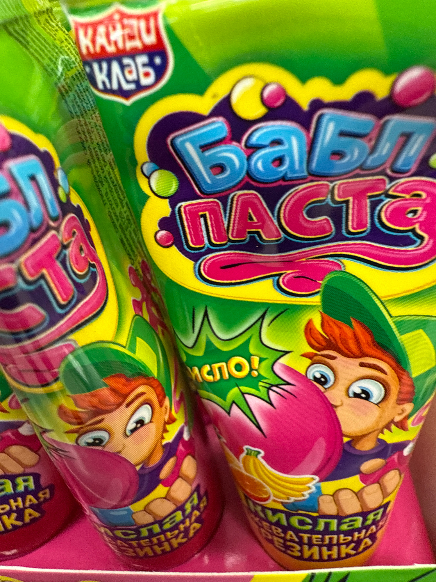 The image shows a close-up of brightly colored candy tubes, labeled "Babi Paste." The tubes feature cartoonish characters and stylized text in Russian. The text also includes "Kandi Klub." Another parβ¦read more
