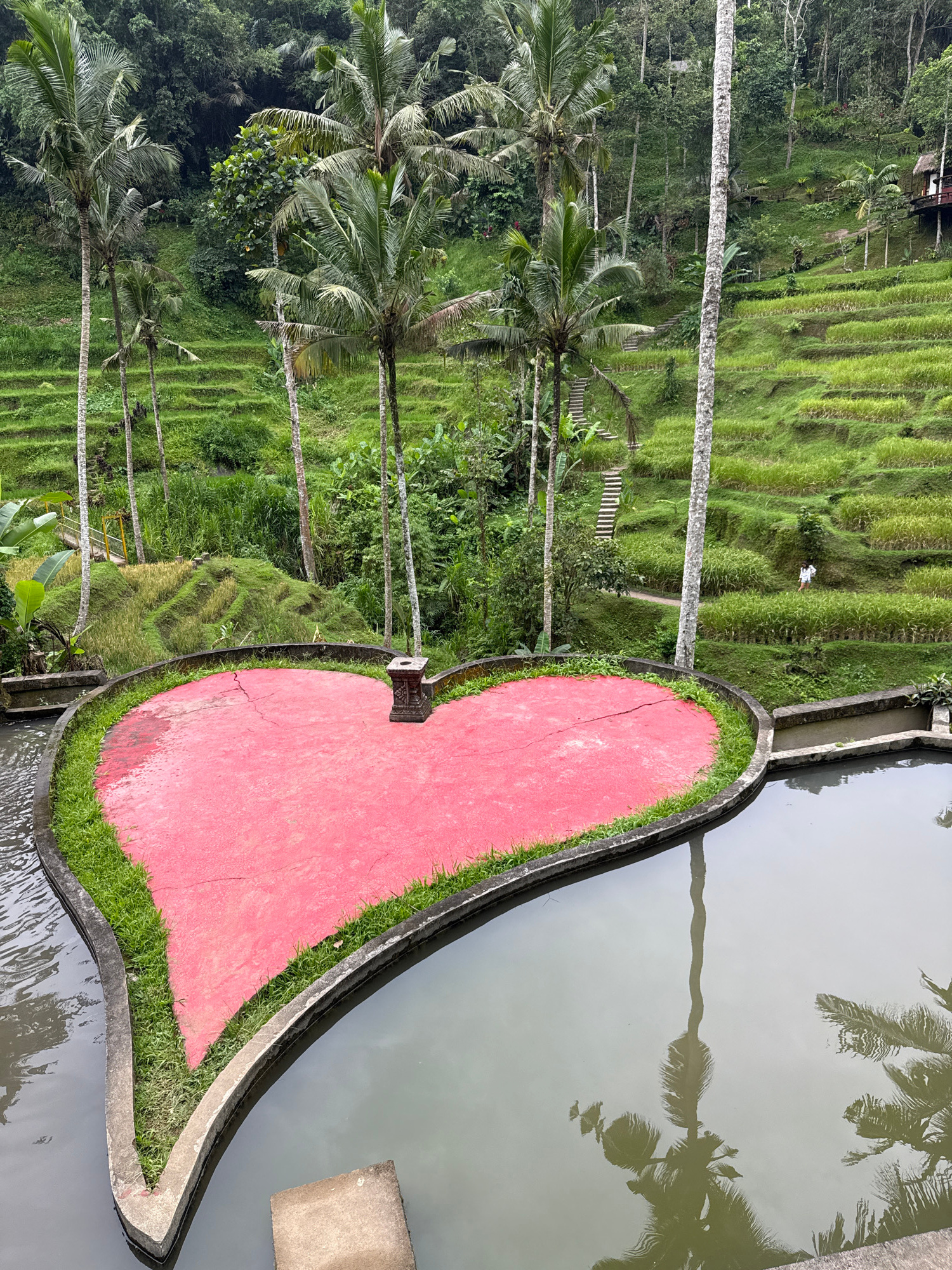 The image captures a vibrant, lush landscape, likely depicting a scenic view in Tegallalang, Indonesia, as suggested by the characteristic terraced rice paddies. In the foreground, a distinctive heart…read more