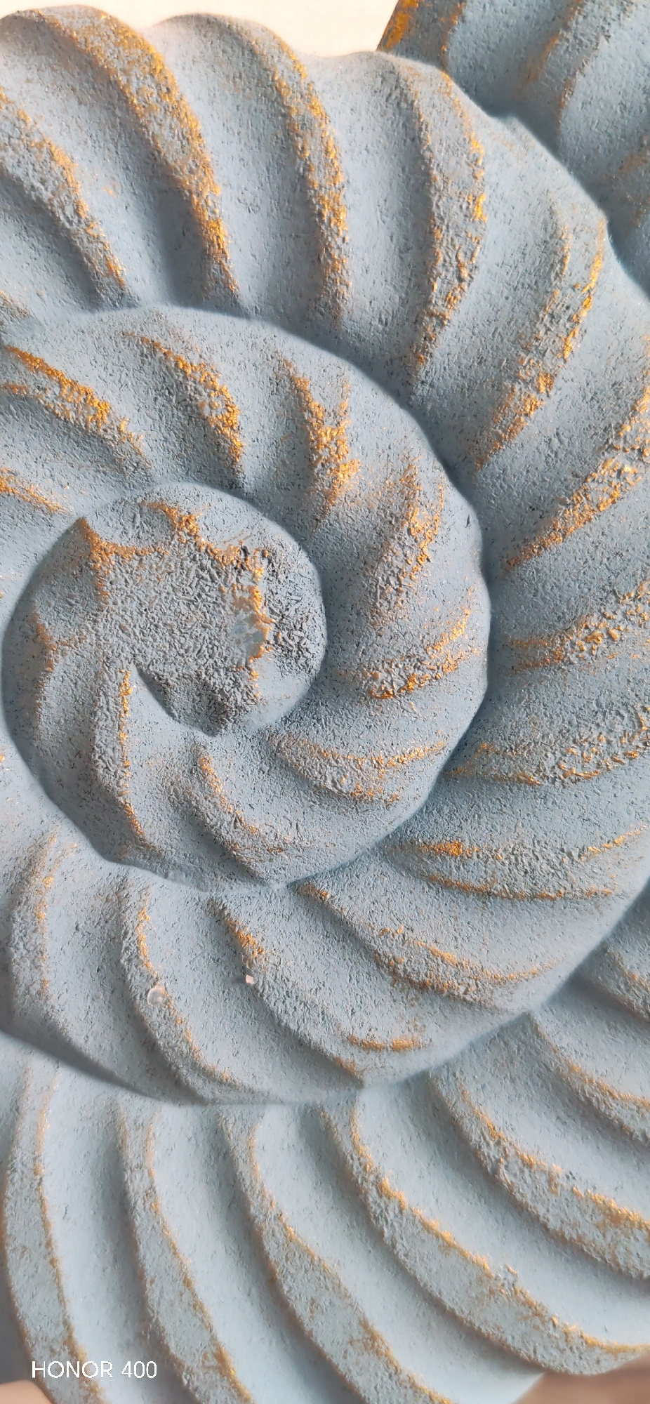 A close-up shot captures a spiral-shaped object. The object is textured, painted in a muted blue-gray, and has traces of gold accentuating its grooves. The bottom left corner of the image shows text t…read more
