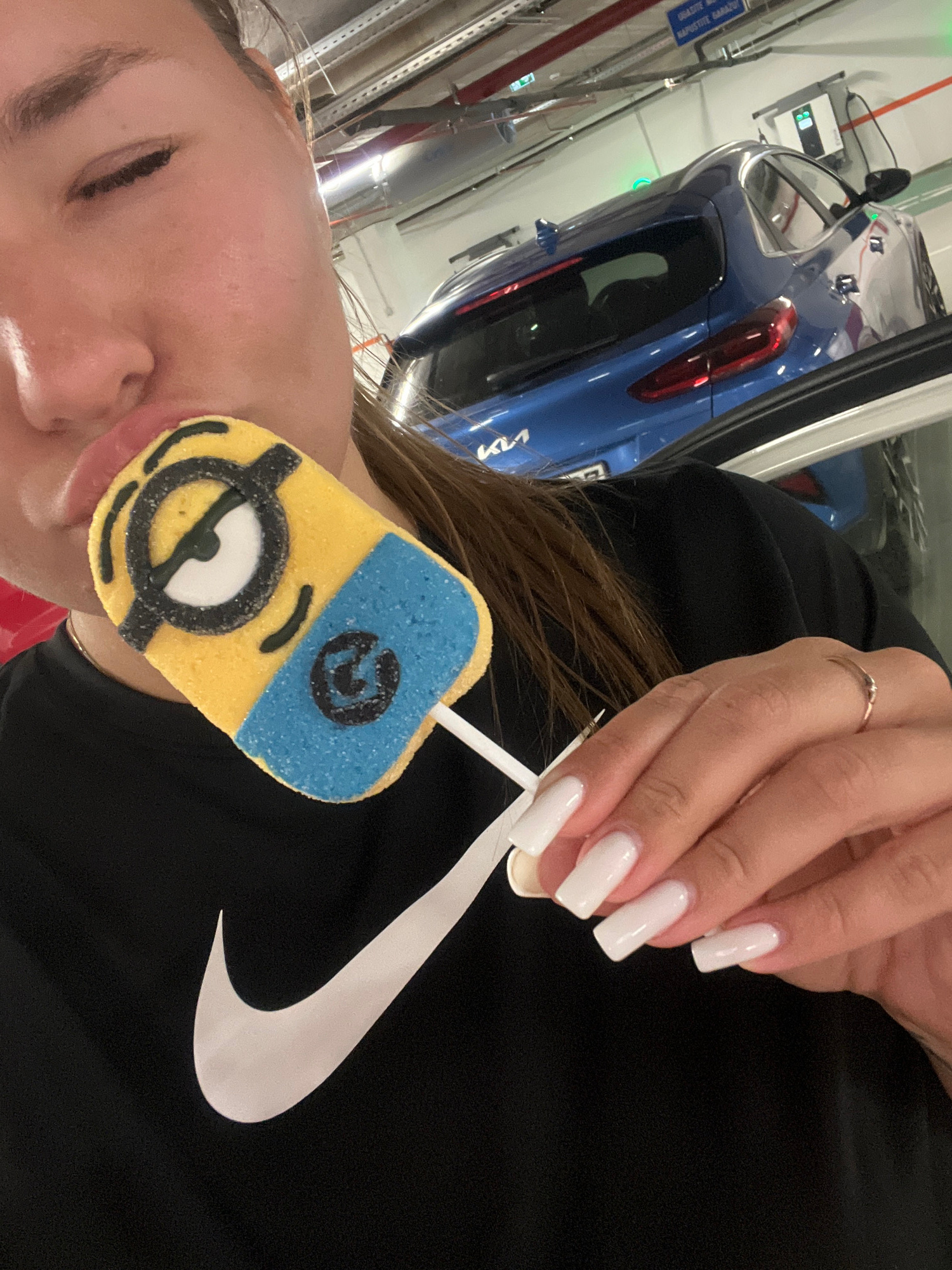 The image shows a person holding a Minion-themed marshmallow lollipop. The person's face is partially visible, with one eye closed and lips slightly parted. Their nails are long and white. They are we…read more