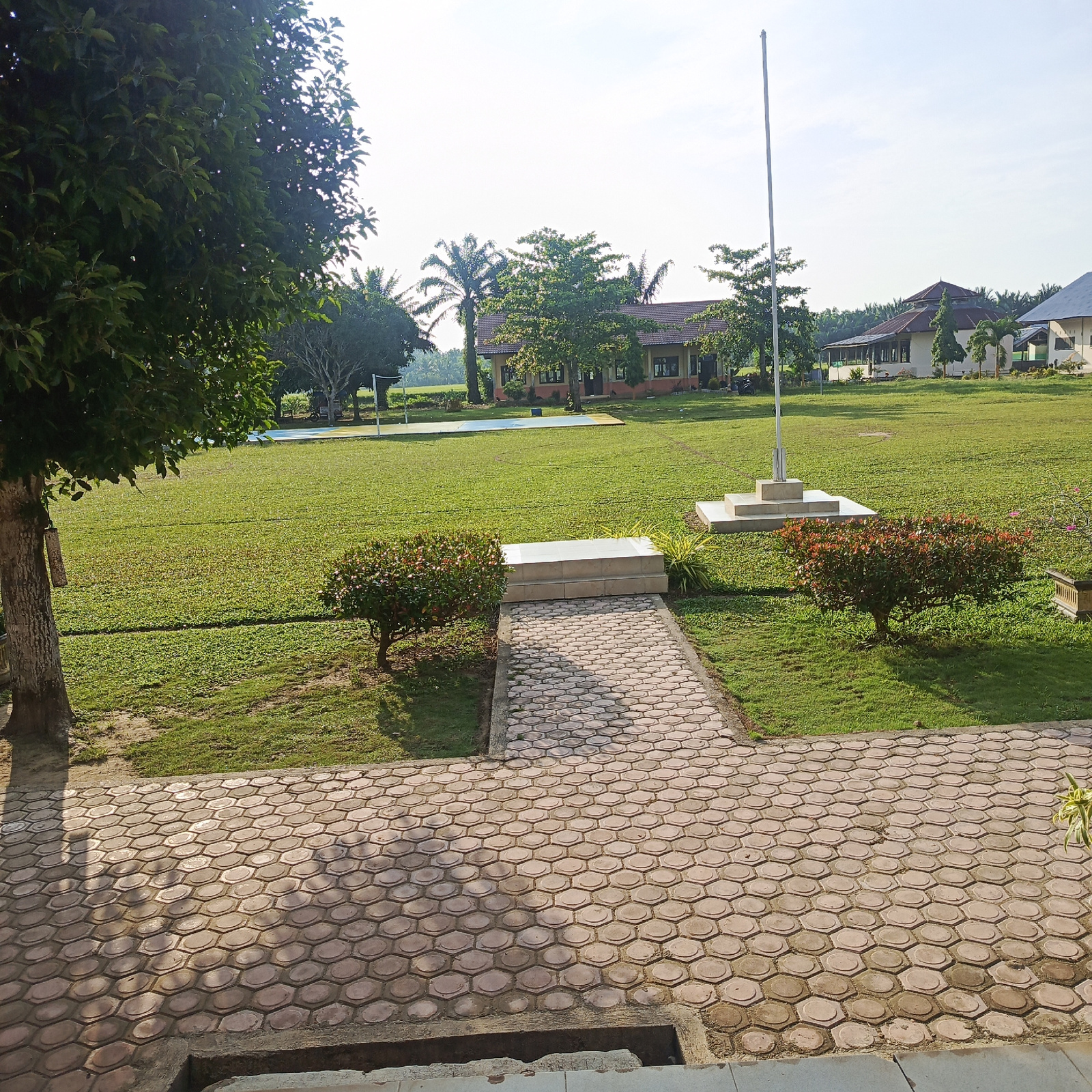 The image captures a bright, sunny view of expansive grounds, likely a school or institutional complex, in Blangriek, Indonesia. In the foreground, a paved pathway made of hexagonal pavers stretches f…read more