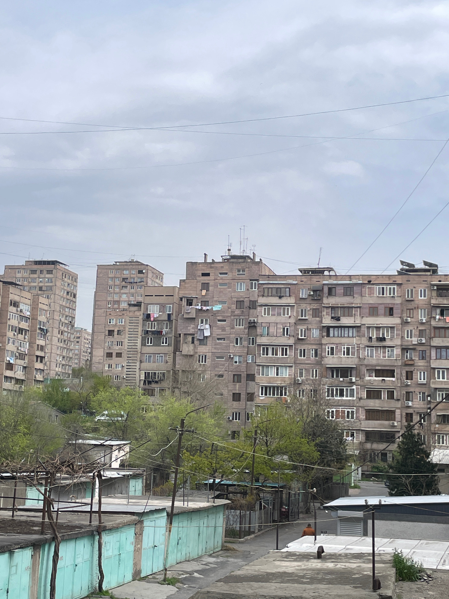 The image shows a view in Yerevan, Armenia, dominated by Soviet-era apartment buildings constructed of grey concrete. The buildings are tall and repetitive, with many windows and balconies. In the forβ¦read more