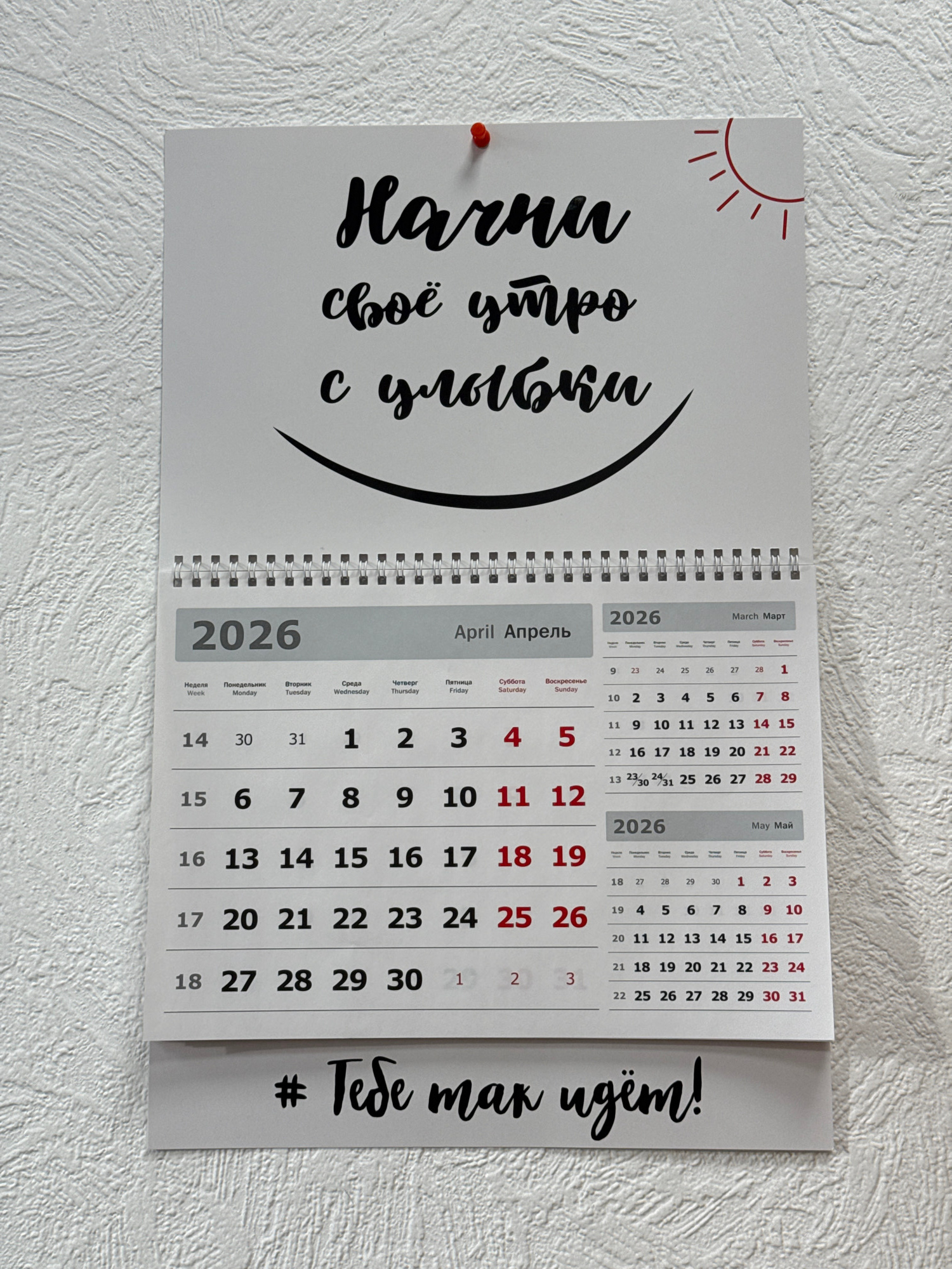 Here is a detailed description of the image: The image is a close-up shot of a wall calendar hanging on a white wall. The calendar displays the month of April 2026, along with snippets of March and M…read more