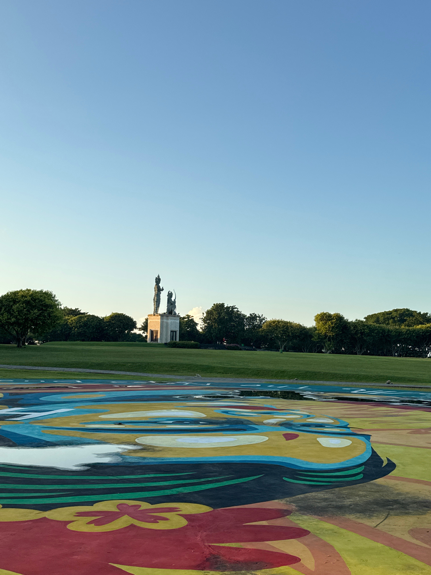 The image shows a view of a park with a colorful painted surface in the foreground. In the distance, a statue is visible. The sky is clear blue. The location is Kuta Selatan, Indonesia.