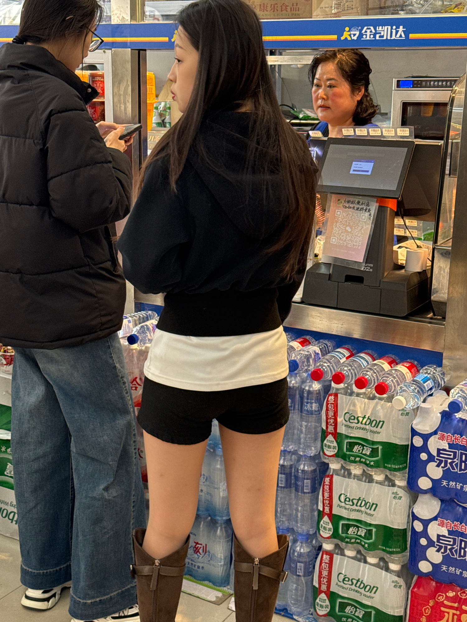 The image shows two young women at the checkout counter of a convenience store, likely in Zhongtun, China. One woman, wearing a black jacket and jeans, is using her phone while waiting. The other woma…read more