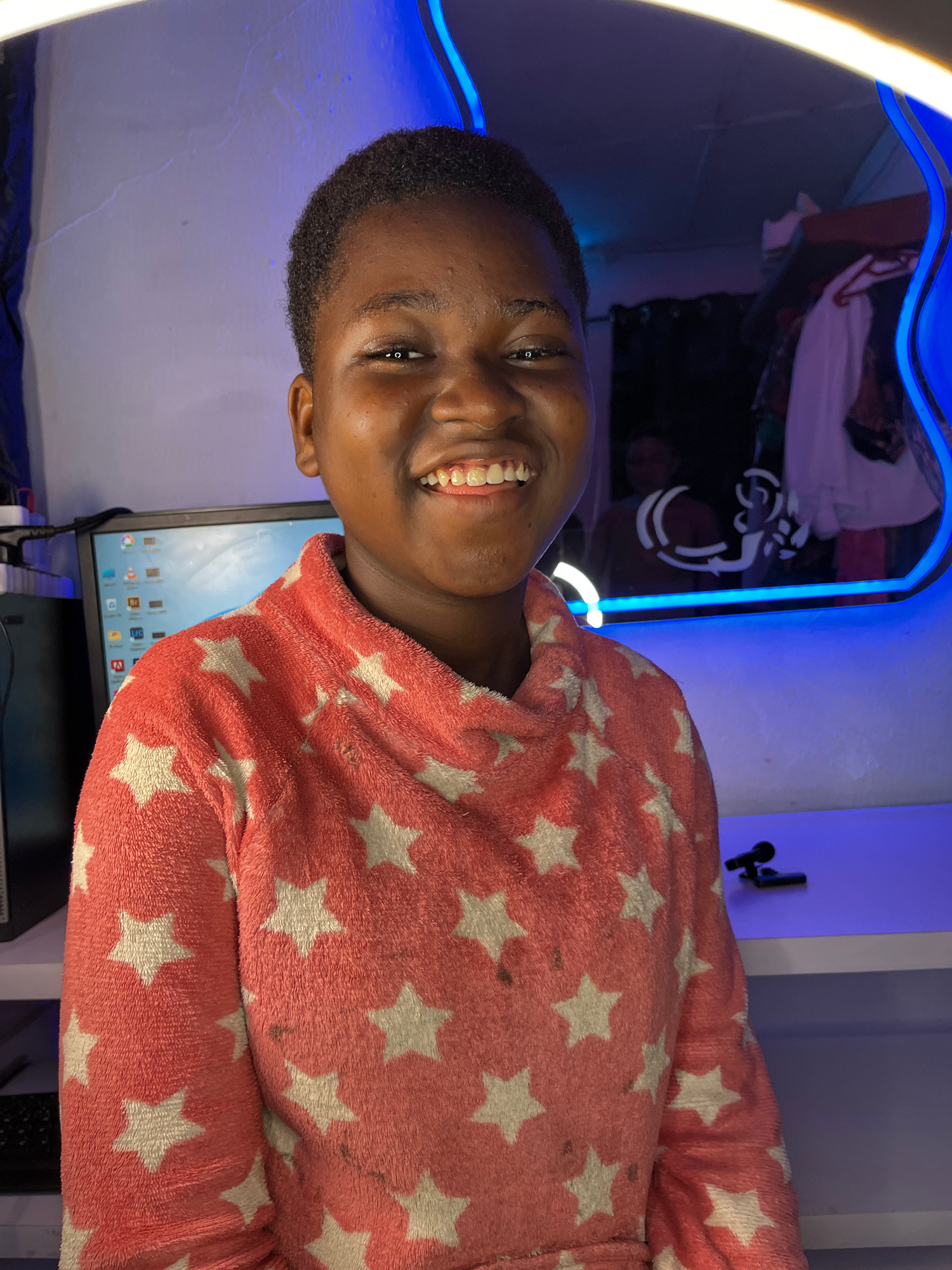A person with short dark hair and a broad smile is wearing a pink bathrobe patterned with white stars. The person is in front of a computer monitor displaying desktop icons and a curved mirror outline…read more