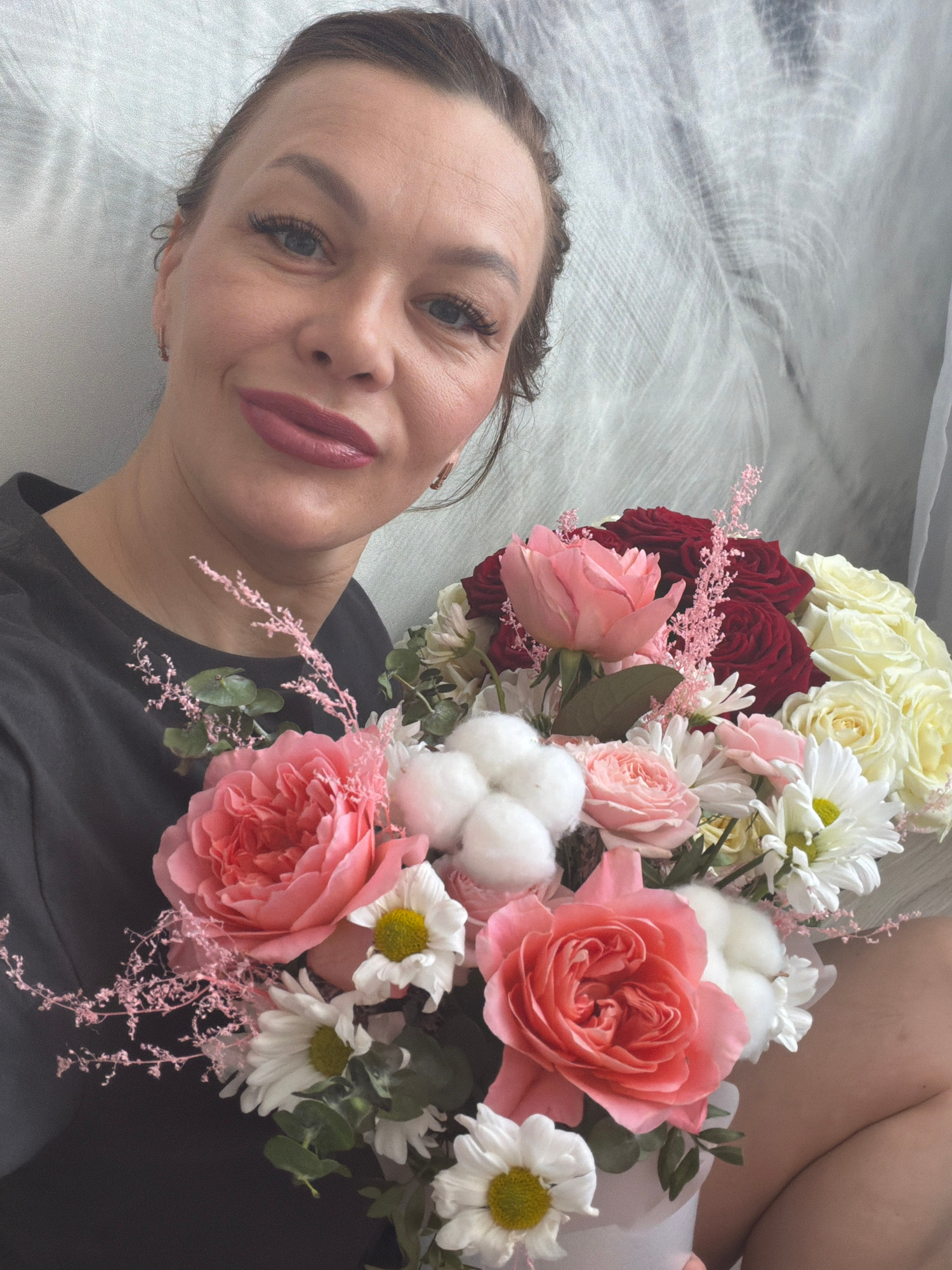 A woman with fair skin, light eyes, and dark hair styled back from her face is lying down, holding a large bouquet of flowers. She is wearing a dark-colored shirt, and her lips are painted a mauve col…read more