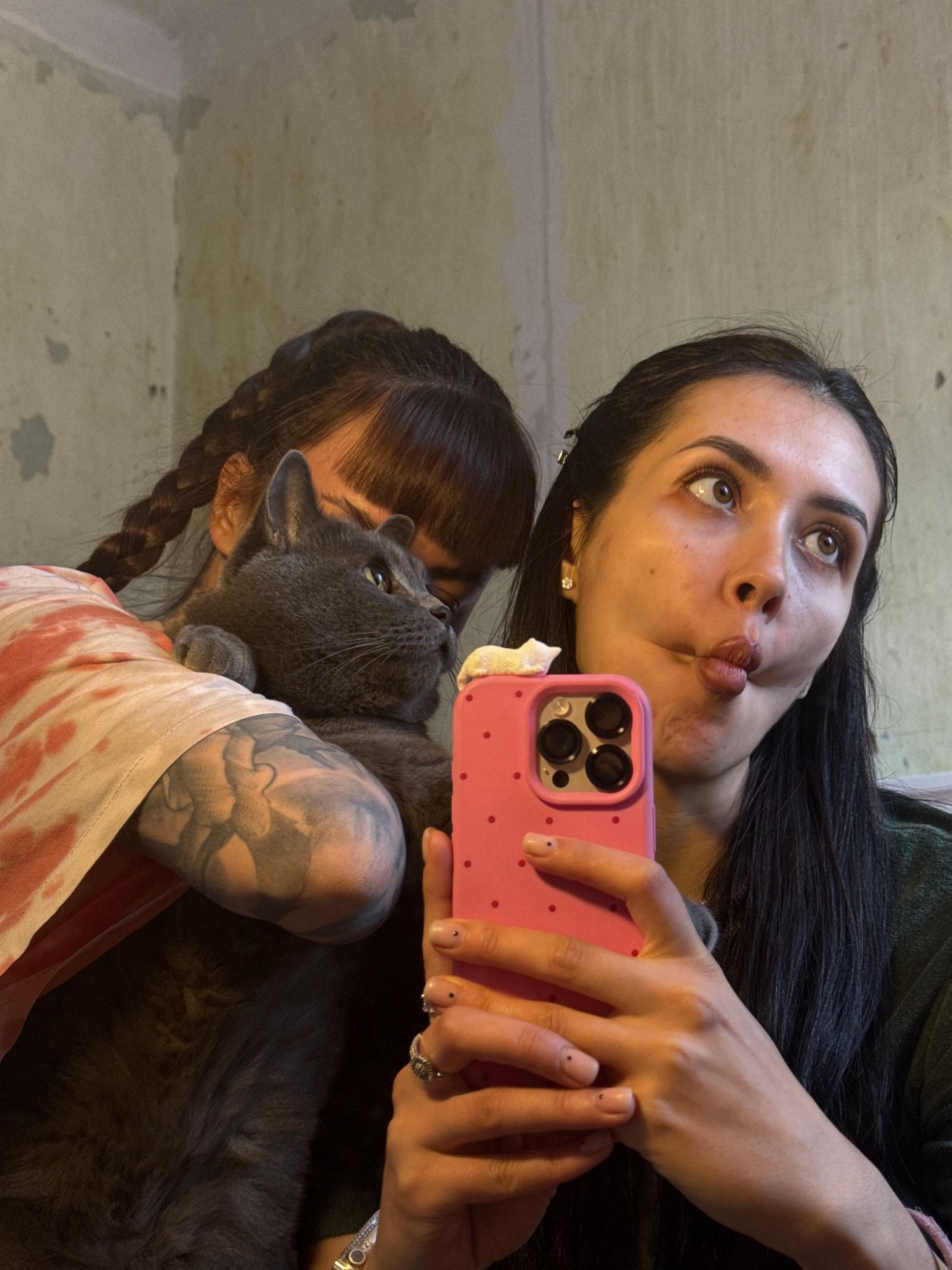 A woman is holding a pink cellphone with a white cat-shaped attachment and taking a selfie. She is pouting and looking upward. A gray cat is being held by another person in the frame. The other person…read more