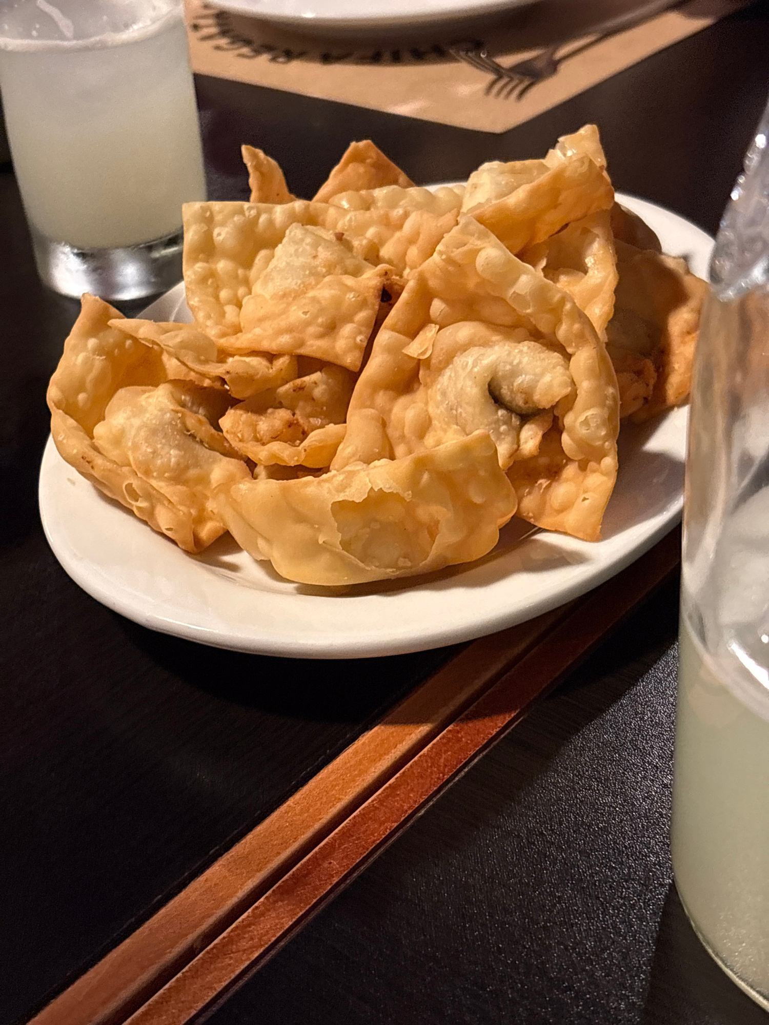 The image shows a plate of fried wontons, likely served as an appetizer, positioned on a black surface, possibly a table. A pair of brown chopsticks rests adjacent to the plate on the right. There's a…read more