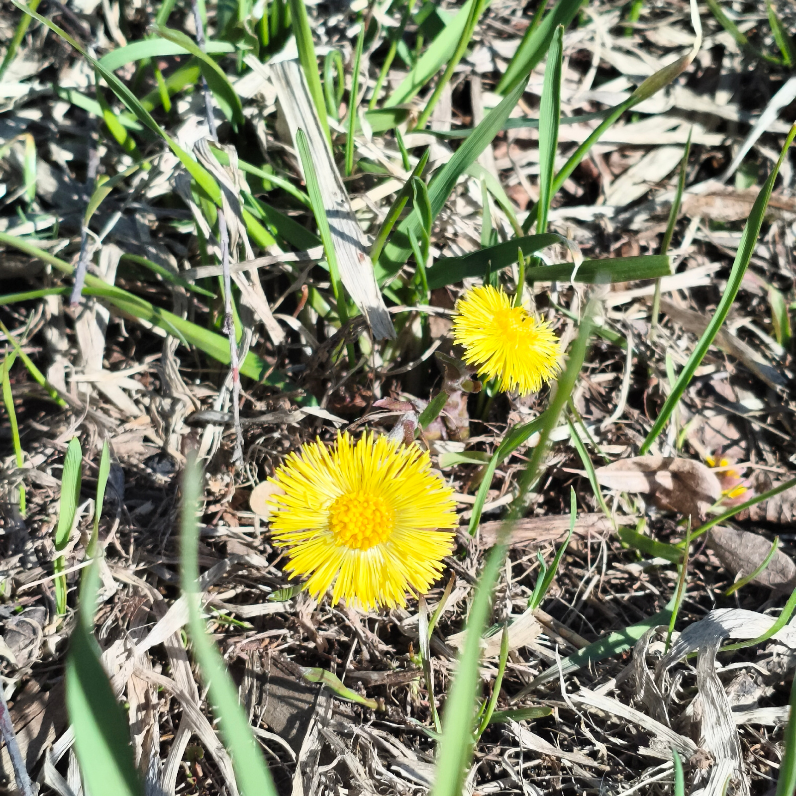 The image shows two yellow coltsfoot flowers (Tussilago farfara) growing amidst green grass and dry, brown plant debris. The flowers are in bloom, with bright yellow petals radiating from a central di…read more