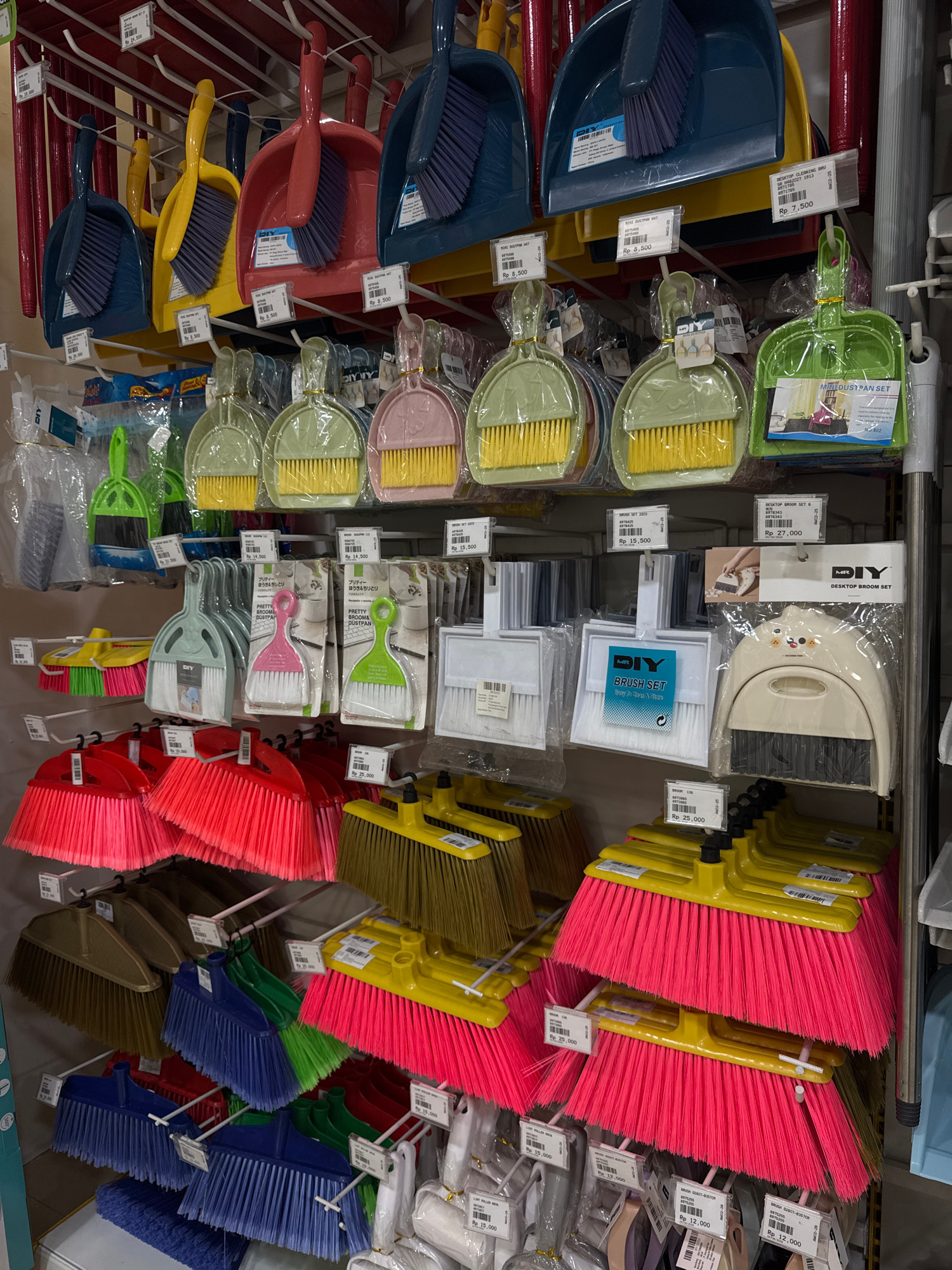 The image depicts a display of cleaning supplies in a retail setting. The items consist of a variety of brooms, dustpans, and desktop cleaning sets, arranged on shelves. Various price tags are affixed…read more